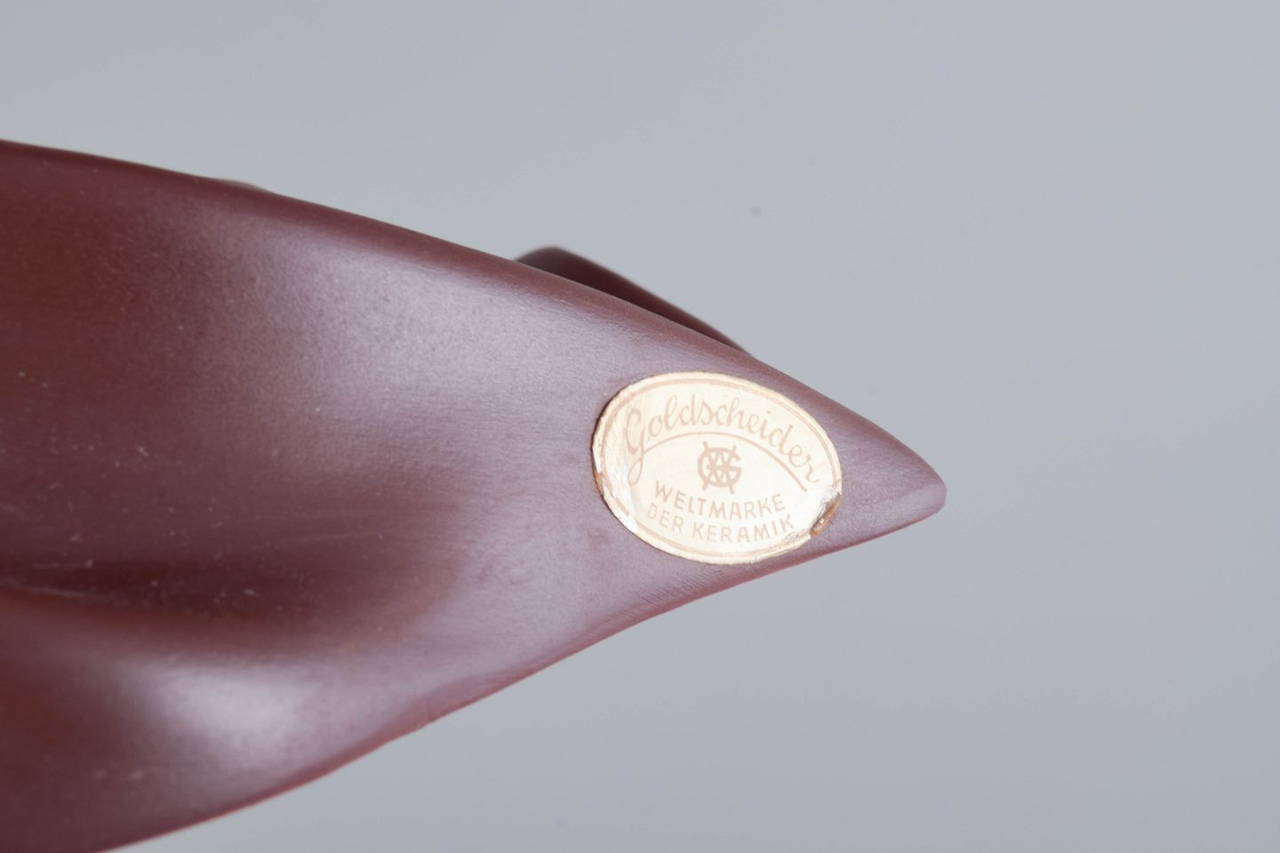 Glasur i dyb bordeauxrød nuance. Med original Goldscheider Wien mærkat.