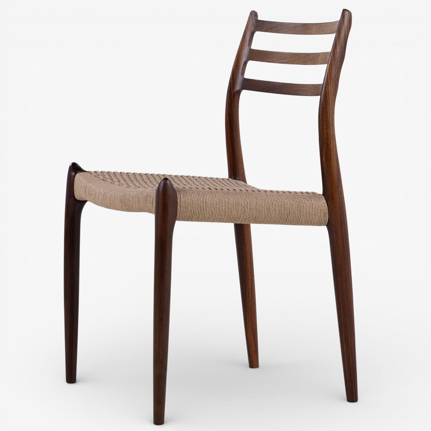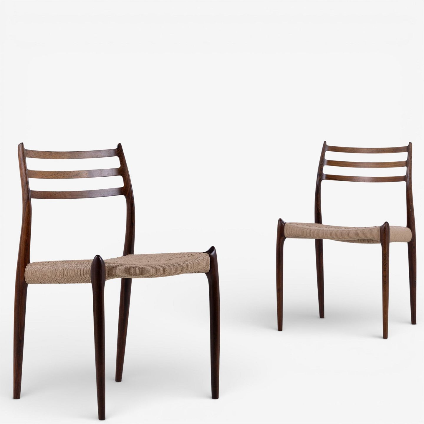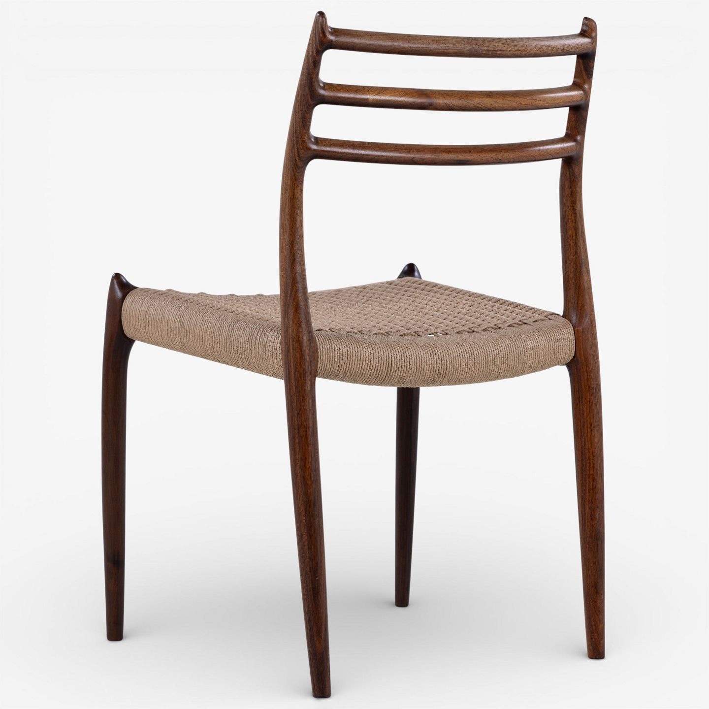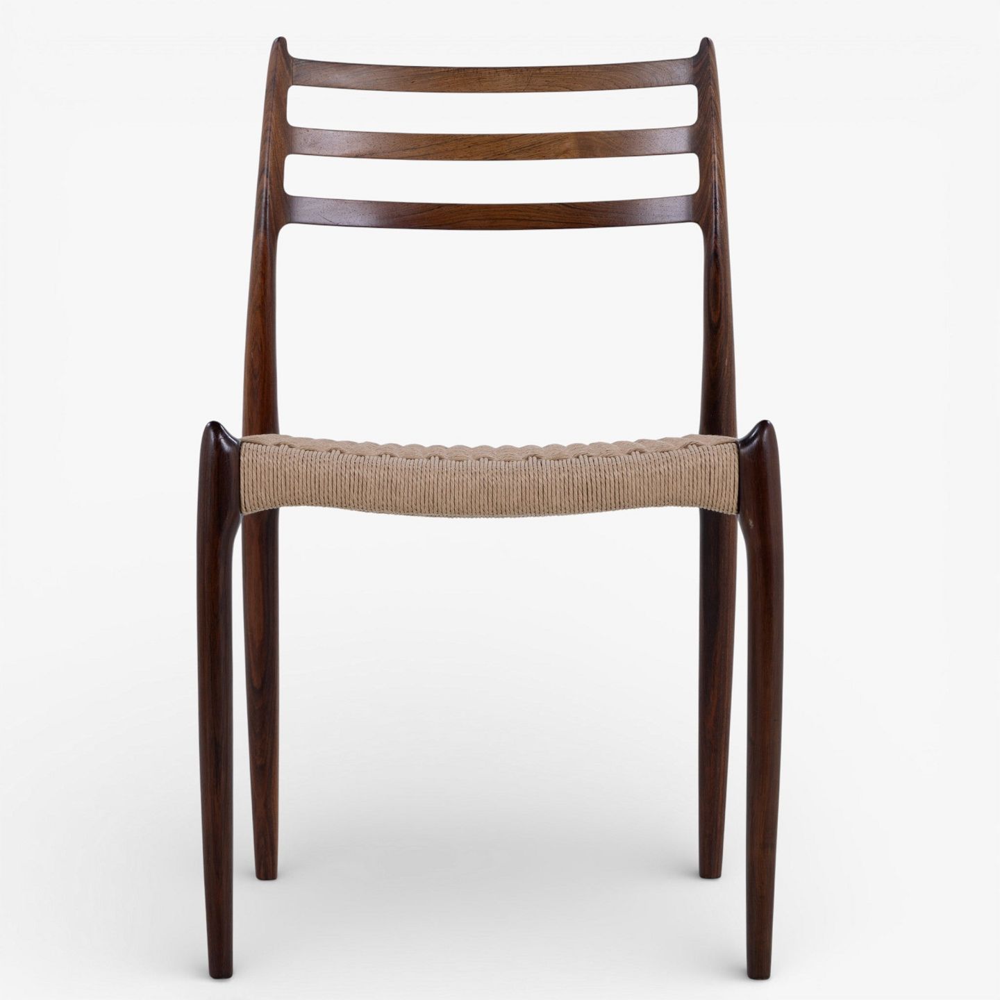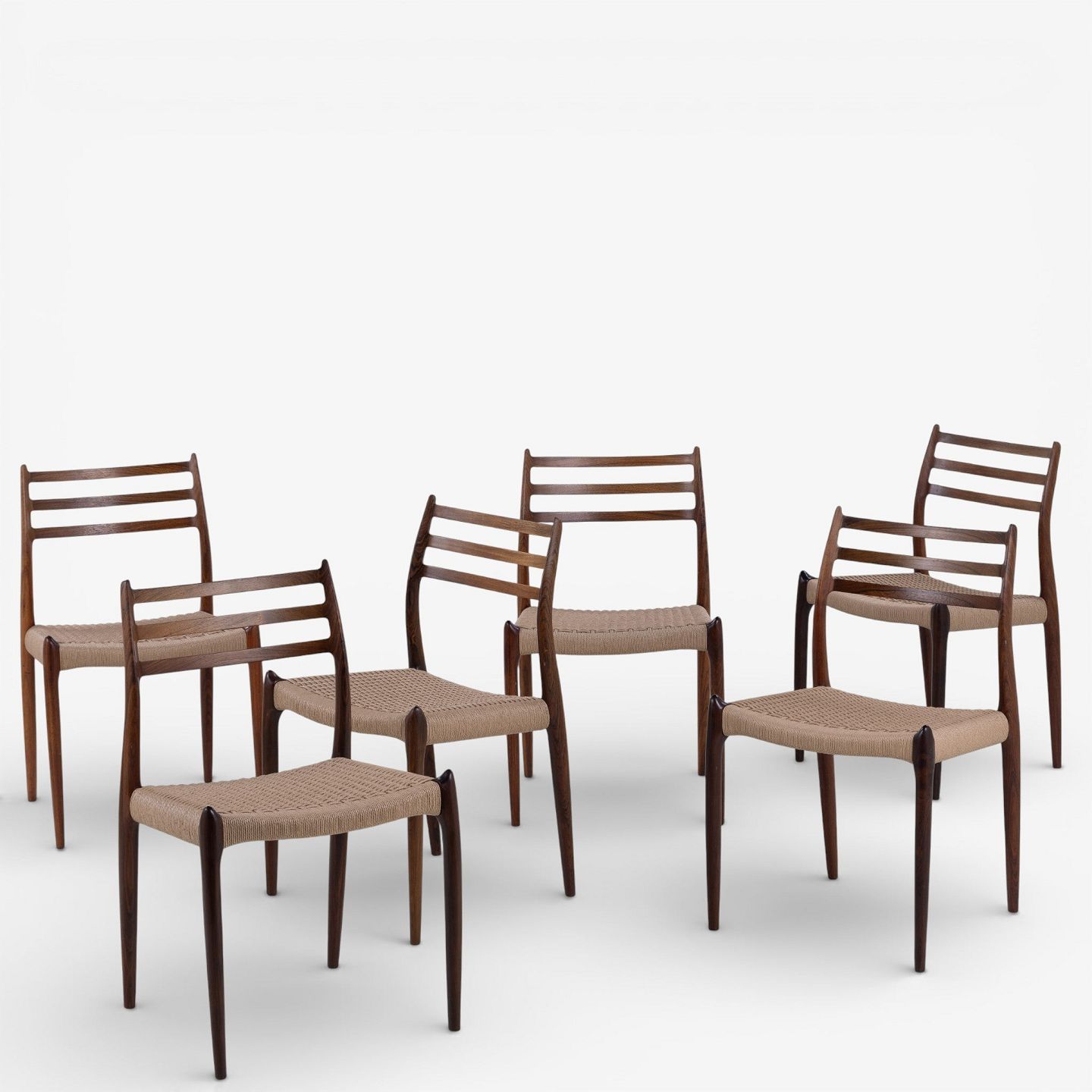 NO 78 - Sæt á 6 spisestole i palisander med sæde i papirgarn. Mærket fra producent.