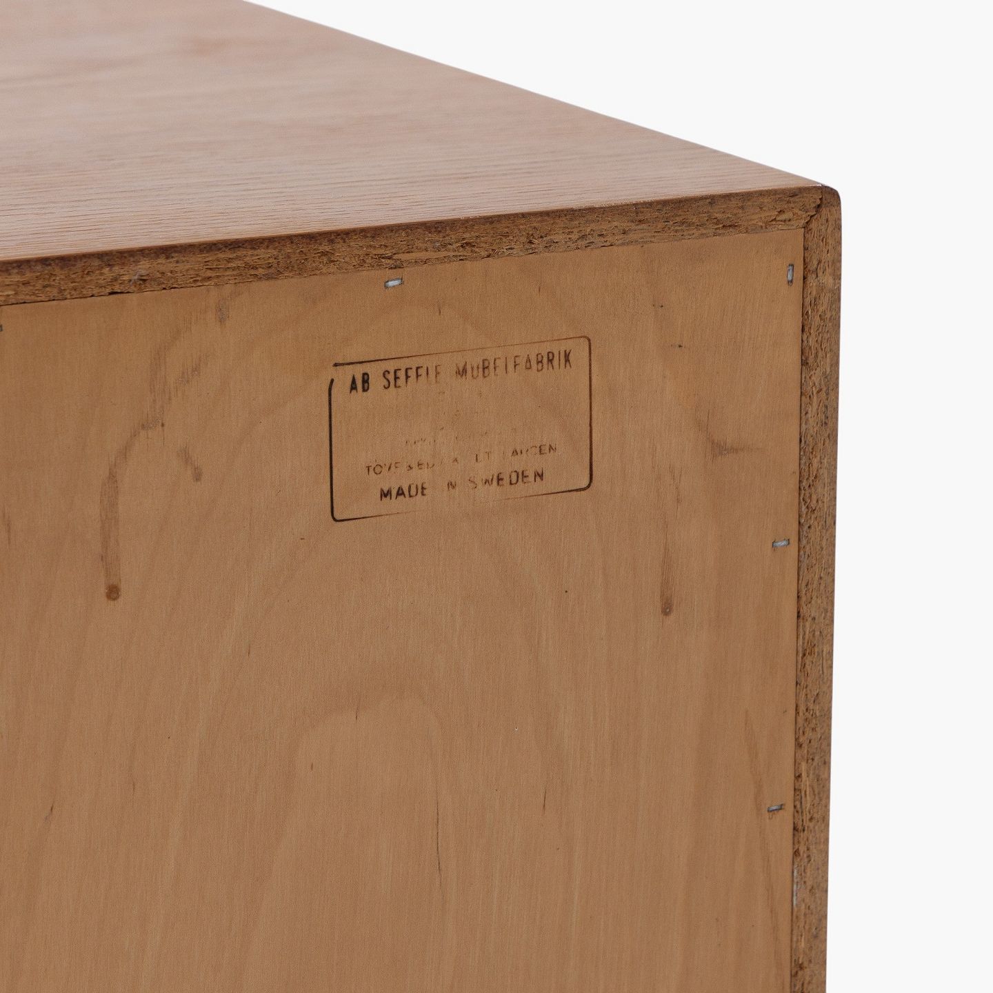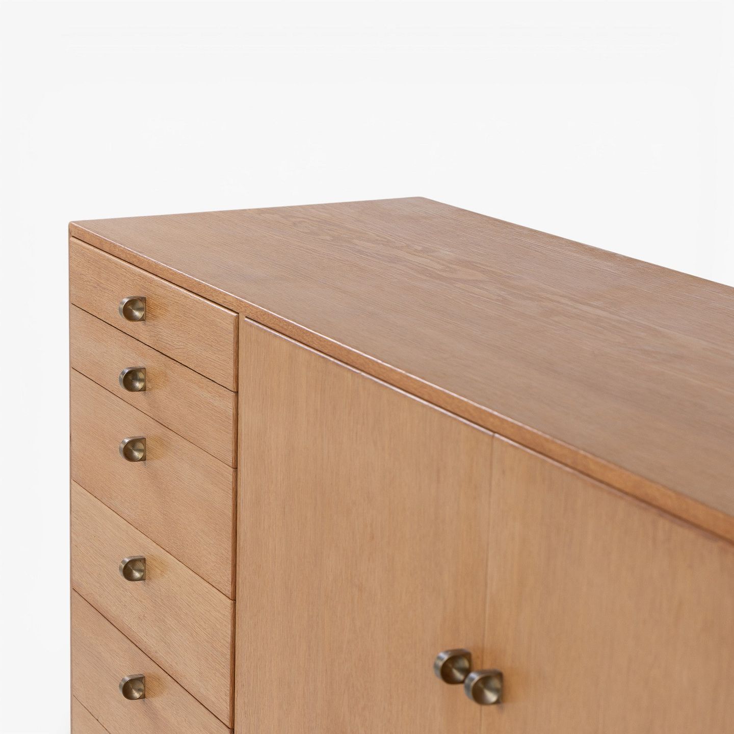 Skænk i patineret egetræ med to låger og otte skuffer m. messinggreb. Stemplet fra producent.
