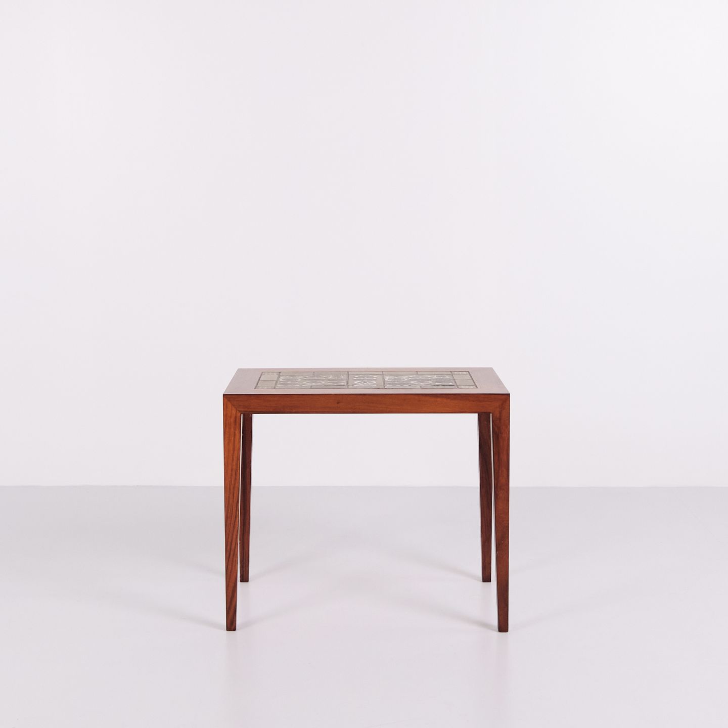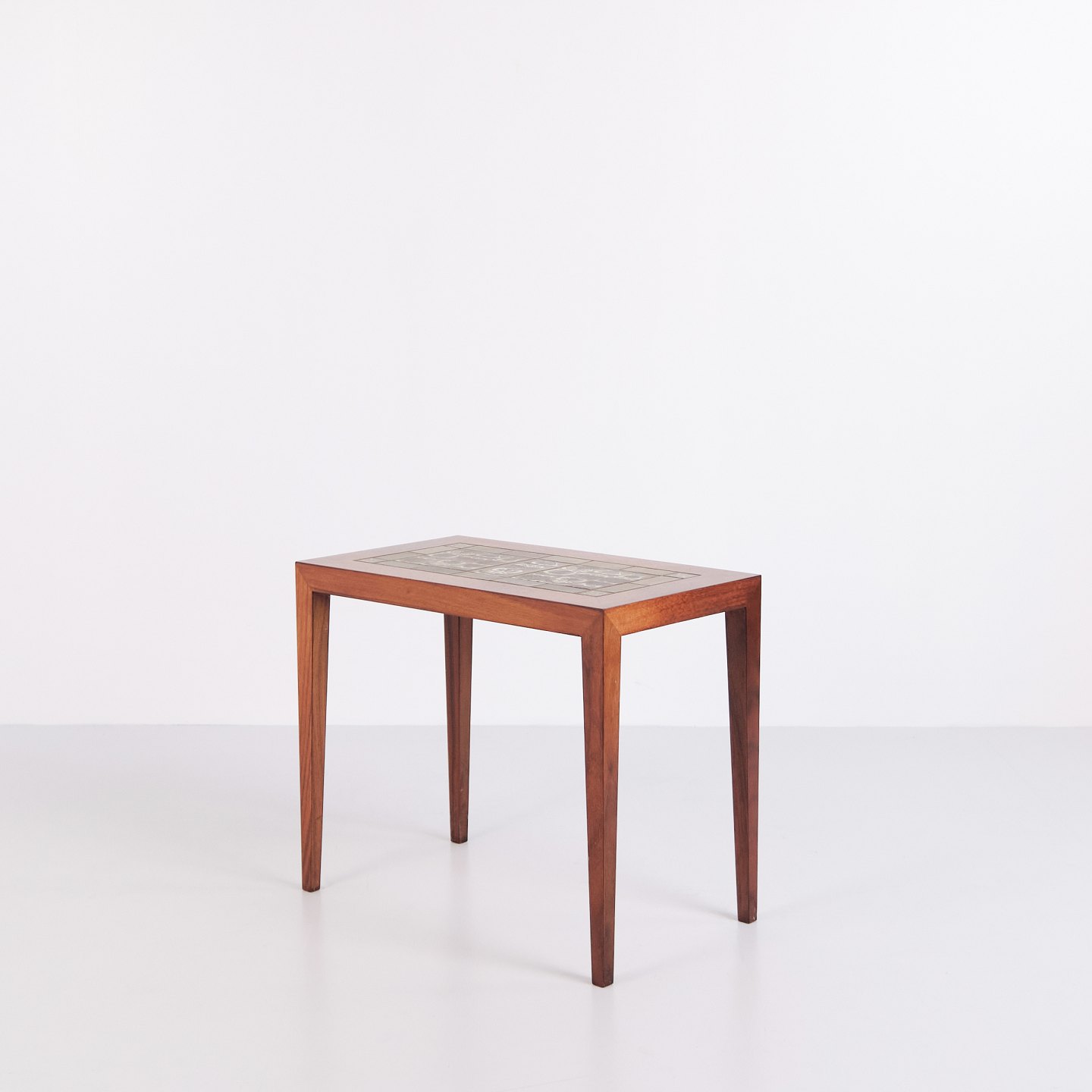 Sidebord, model 163, designet af Severin Hansen og produceret hos Haslev Møbelsnedkeri. Bordet er udført i træ og forsynet med indlagte grønne fajancekakler designet af Nils Thorsson for Royal Copenhagen. Kombinationen af møbelsnedkerarbejde og keramiske kakler er karakteristisk for samarbejder fra 1960’erne og repræsenterer klassisk dansk møbeldesign fra perioden.