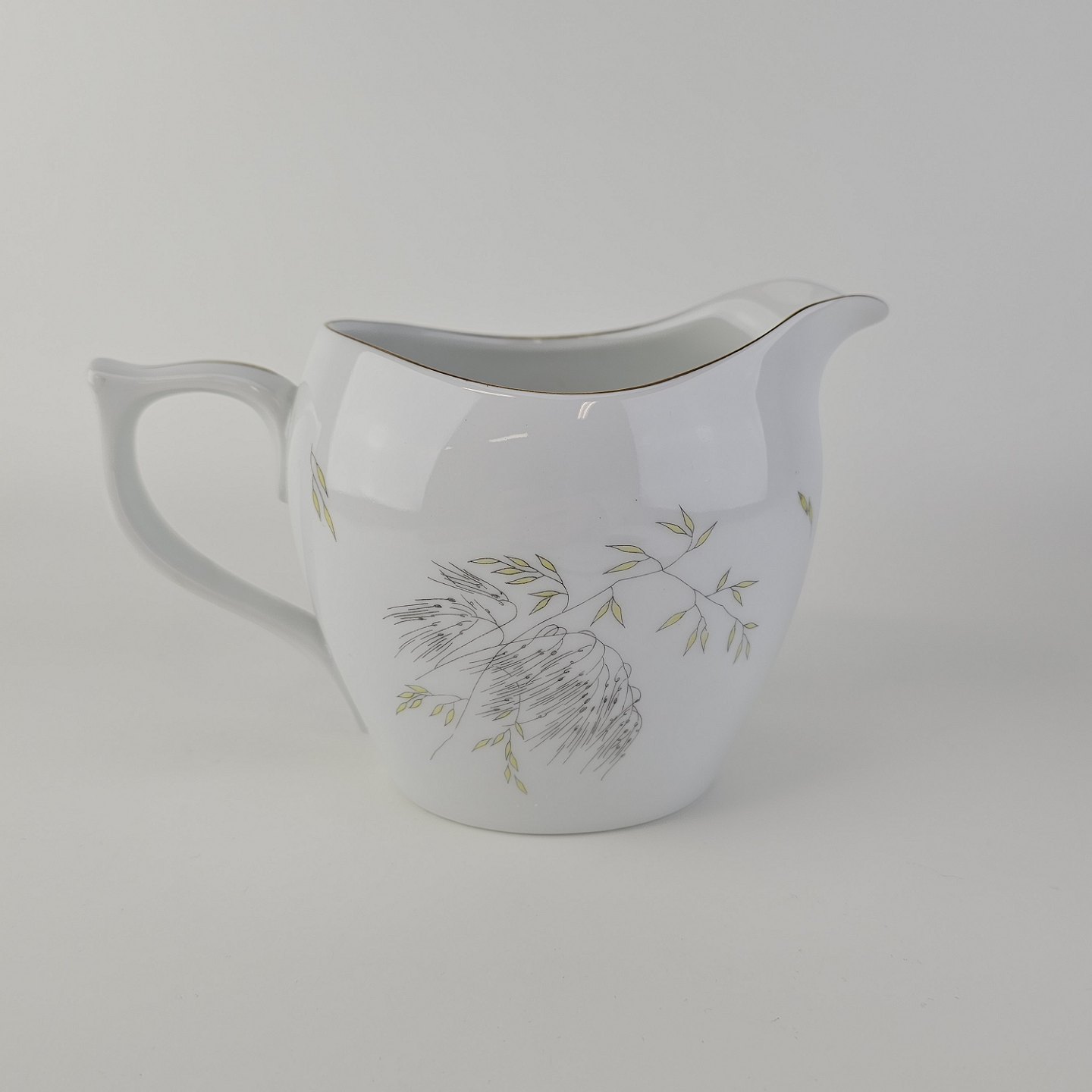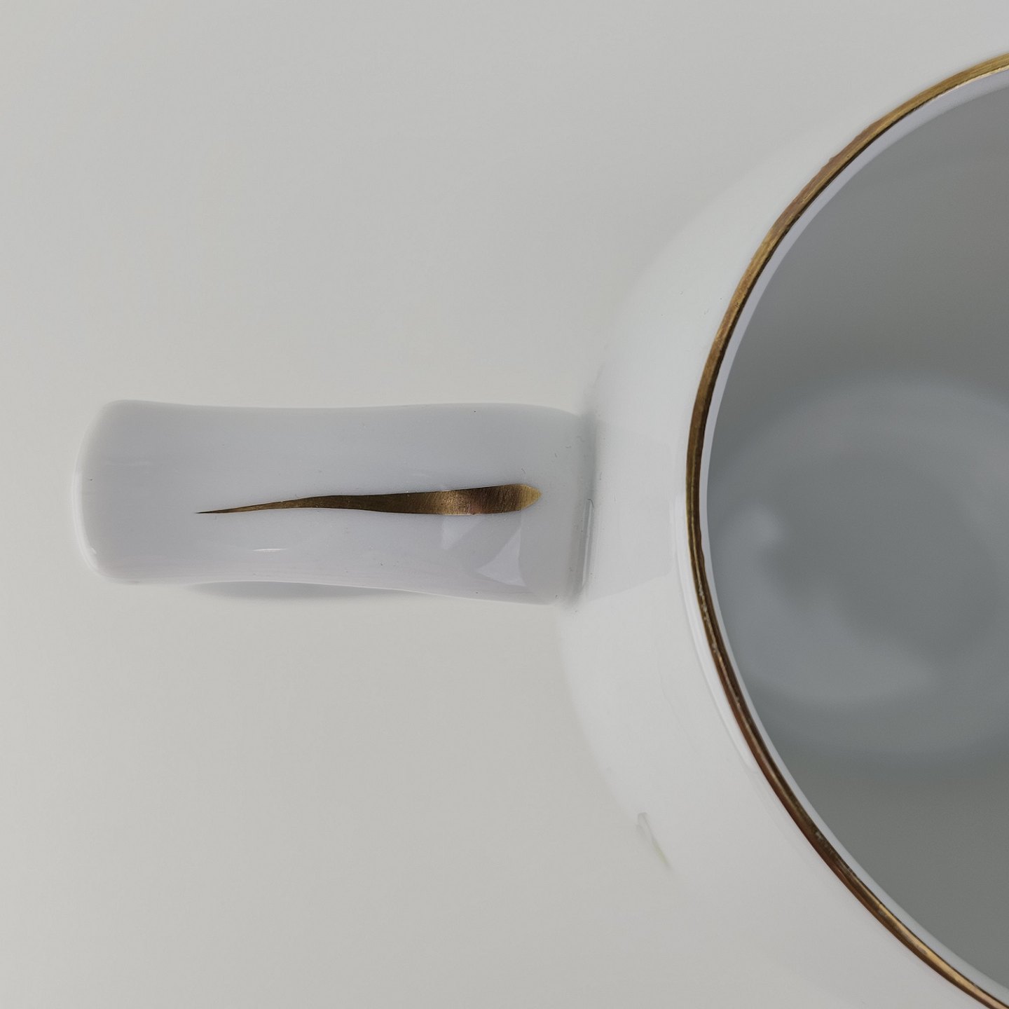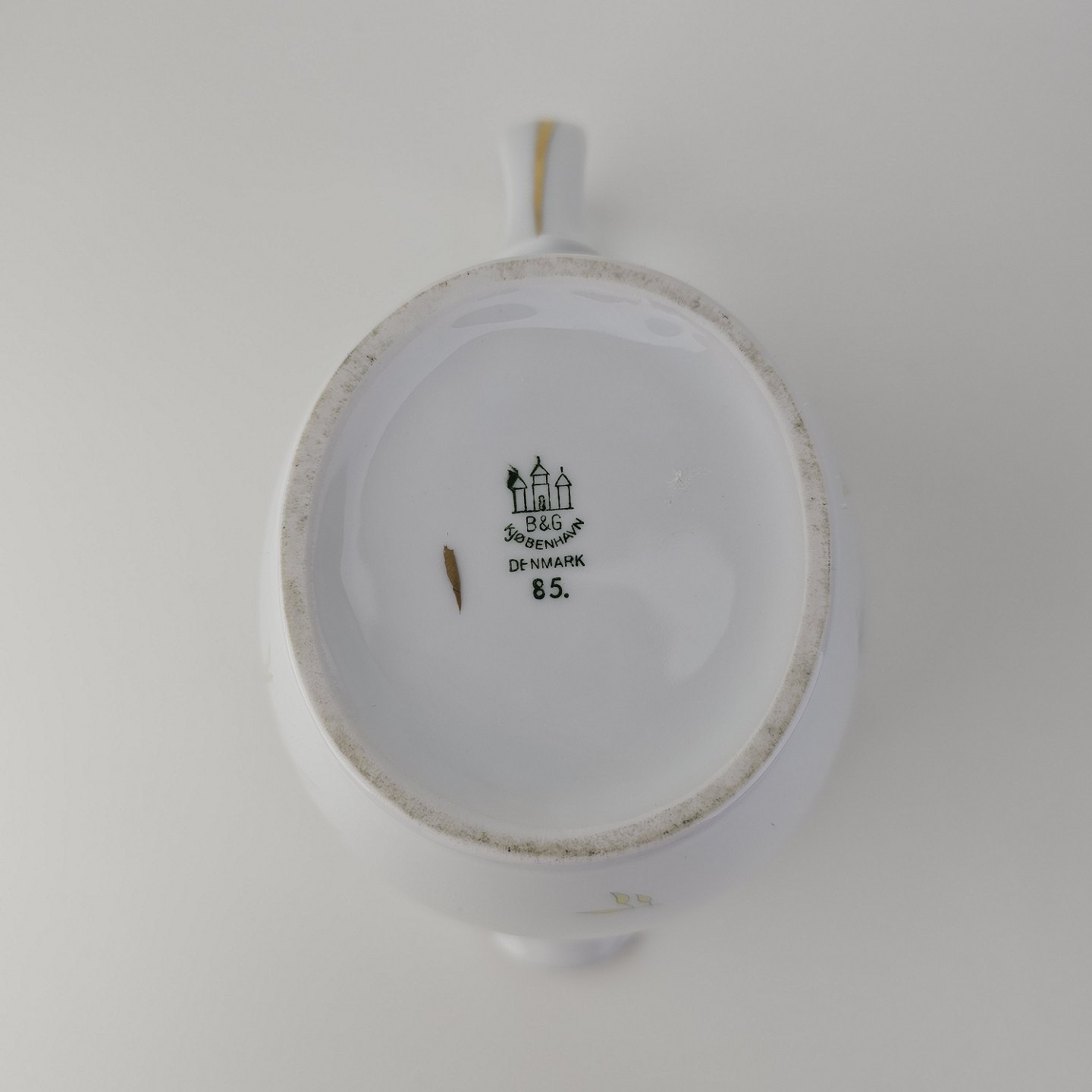Service i hvidt porcelæn med motiv af blomster og guldkant