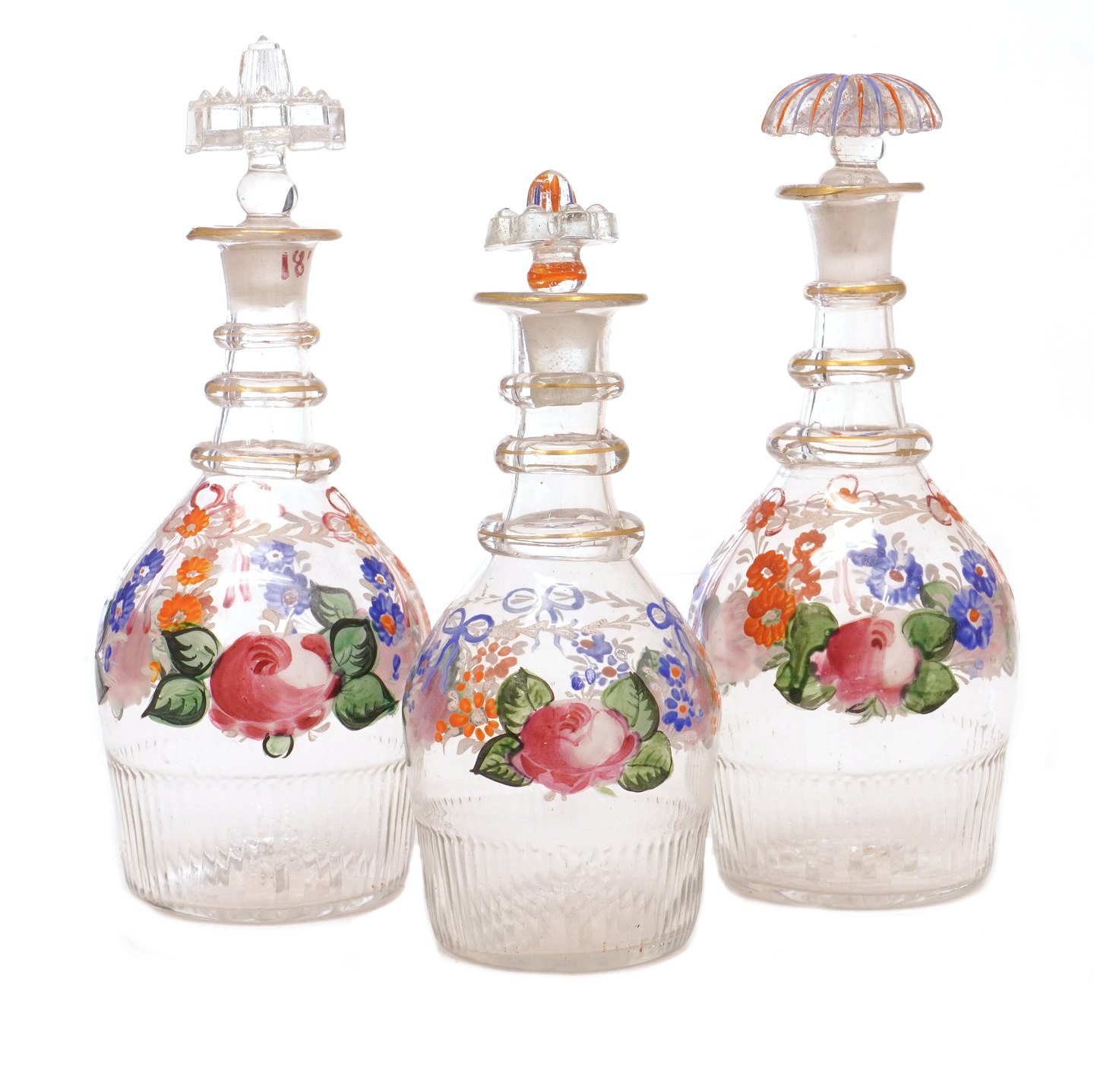 Sæt på tre emaljedekorerede karafler ca. år 1860-80