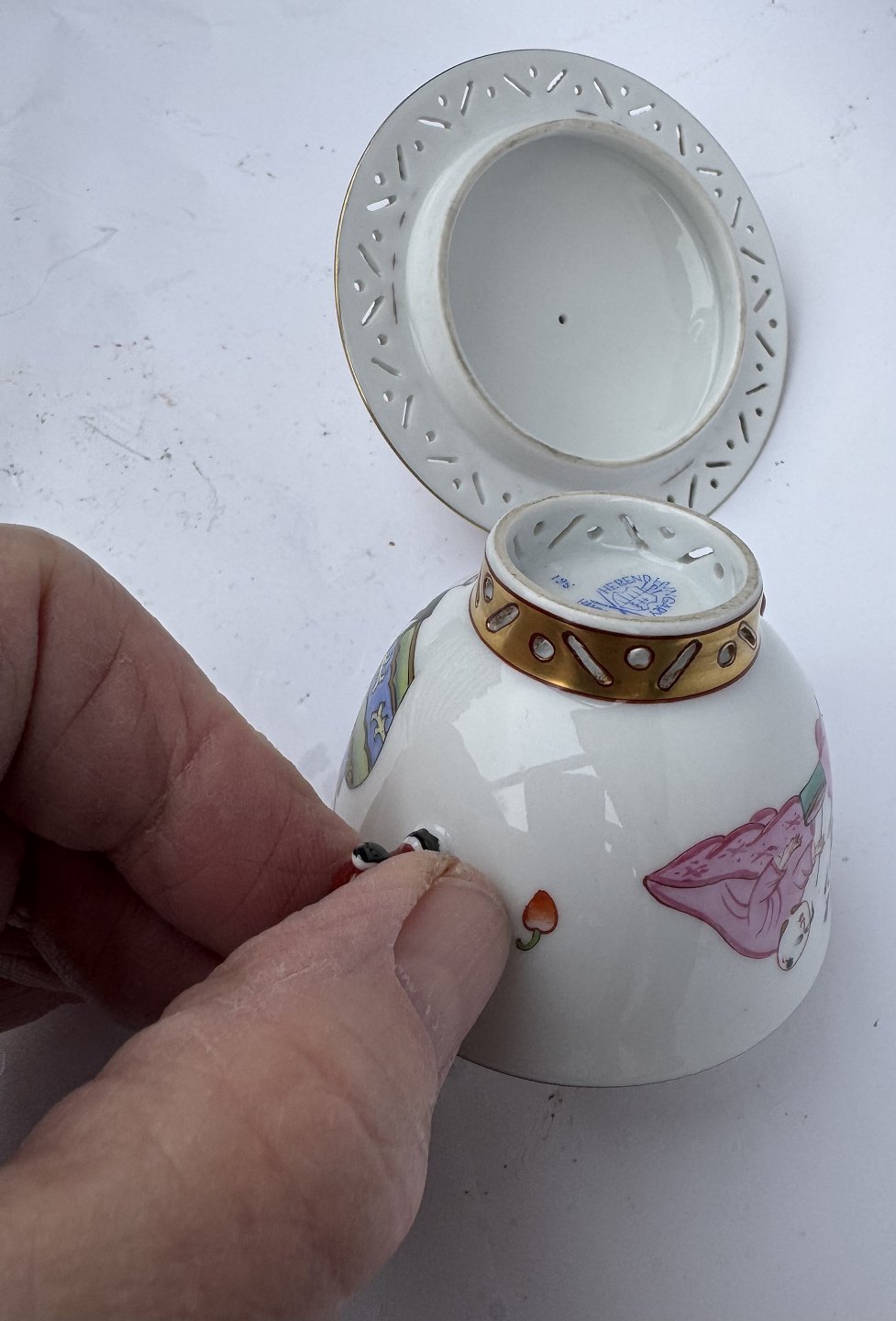 Herend lågskål i porcelæn fra Ming serien. Delikate kinesiske bemalede dekorationer samt figurer. Gennembrudte kanter. I perfekt stand. Fremstillet på den ungarnske porcelænsfabrik Herend i 1930’erne. Mål: H. 8,5 cm. Fra øre til øre 9,3 cm. Lågets diameter 8,6 cm. Bundens diameter 3,2 cm