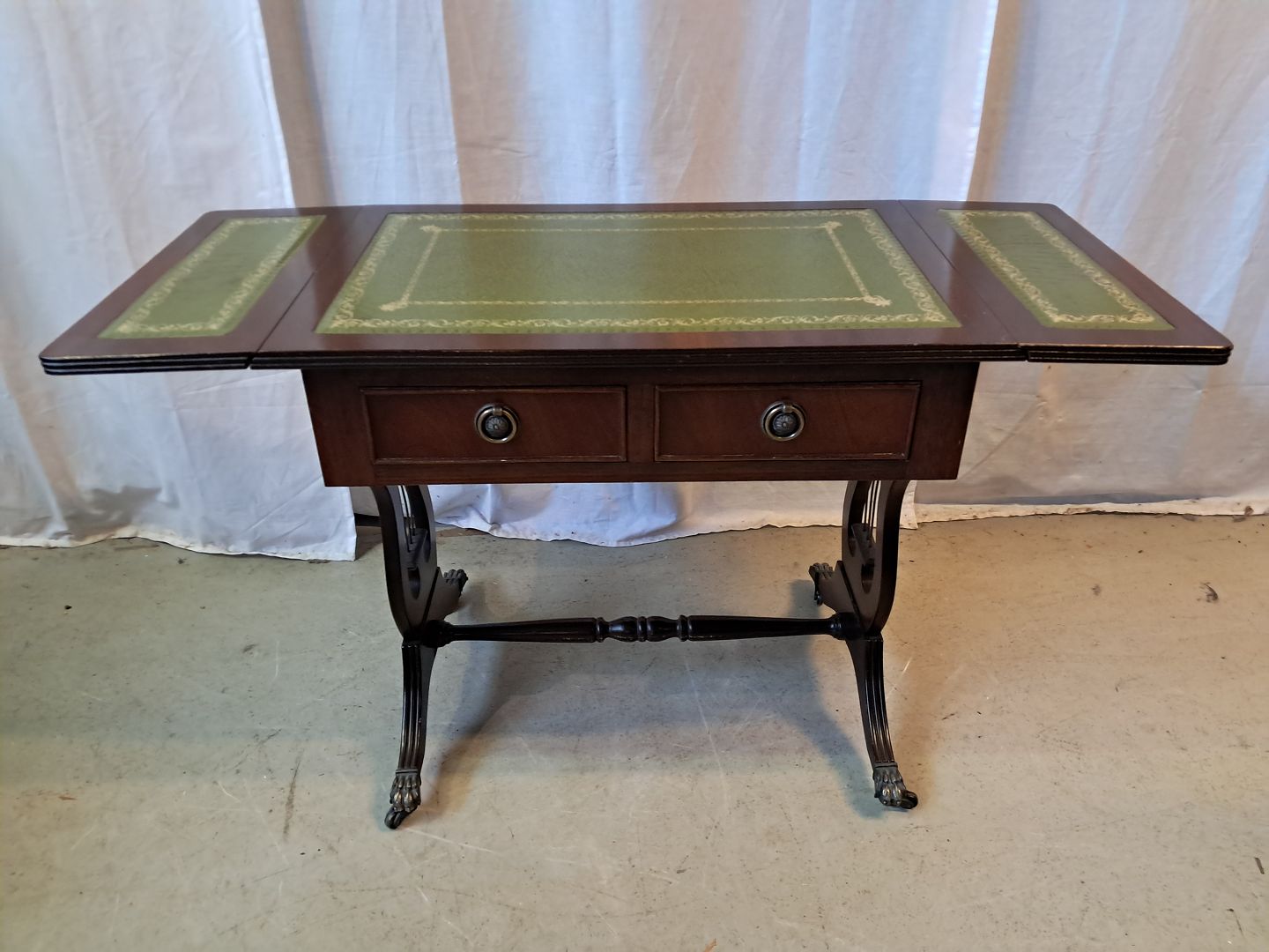 Sofabord i fineret mahogni med læderindlæg, fra 1980erne.