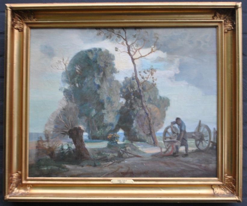 Forup, Carl (1883 - 1939) Danmark: En smed arbejder med en plov. Signeret. Olie på lærred. 45 x 56 cm.