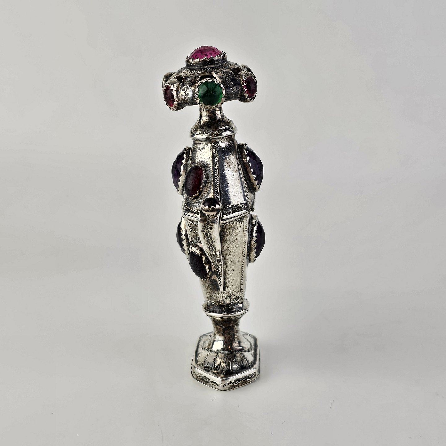 Hovedvandsæg i sølv dekoreret med forskellige smykkesten. Indgraveret under bunden med et hjerte, initialer og årstallet 1955