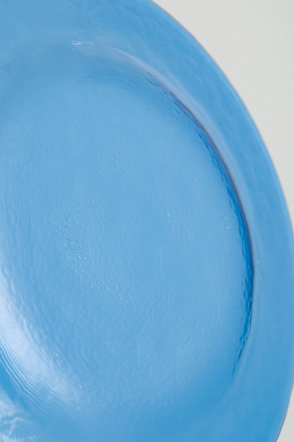 Sæt med tre svenske tallerkener i kraftigt blæst kunstglas i blå nuancer, udført med glat spejl og let ujævn rand, typisk for skandinavisk glasdesign fra midten af det 20. århundrede.