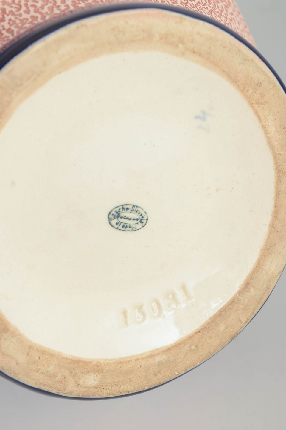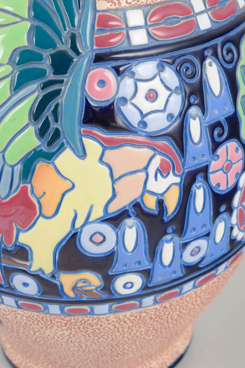 Tjekkoslovakisk kunstkeramik fra 1930’erne var ofte præget af en syntese mellem Art Deco og folkelig ornamentik, hvor stiliserede dyre- og plantemotiver kombineres med geometriske mønstre i kraftige farver. Emaljedekorationen gav mulighed for klare kontraster og høj farvemætning, og store Amphora vaser som denne fungerede som markante interiørobjekter i tidens borgerlige hjem.