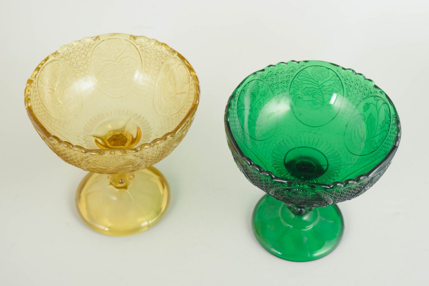 Par pressede glas dessertskåle på fod.