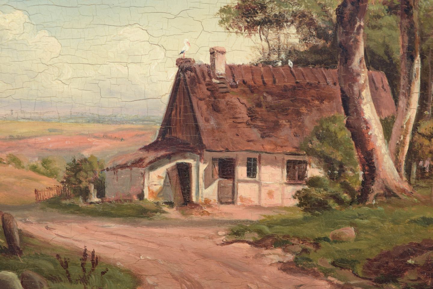 Landskabeligt motiv med bindingsværkshus og snoet vej i et åbent, idyllisk landskab udført i olie på mahogniplade, usigneret.