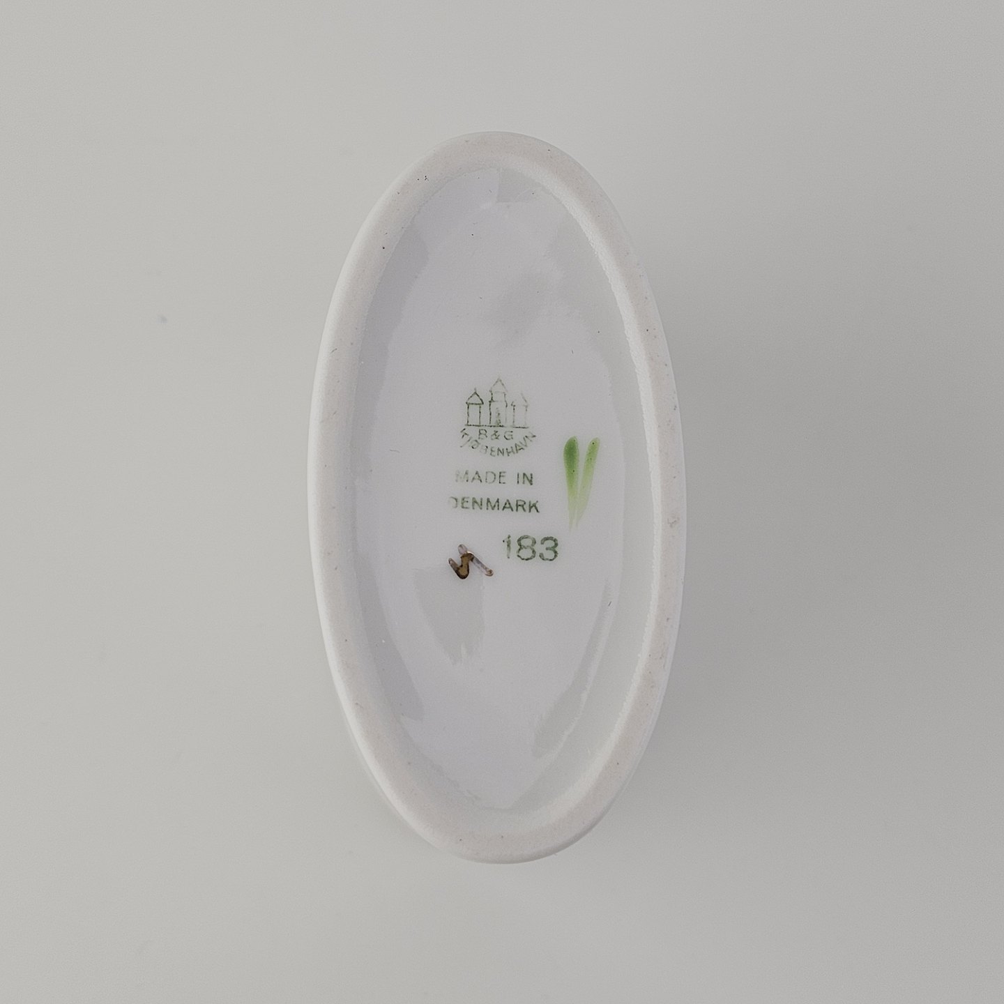 Antonius er af hvidt porcelæn med skælform dekoreret med håndmalede blå anemoner og guldkant