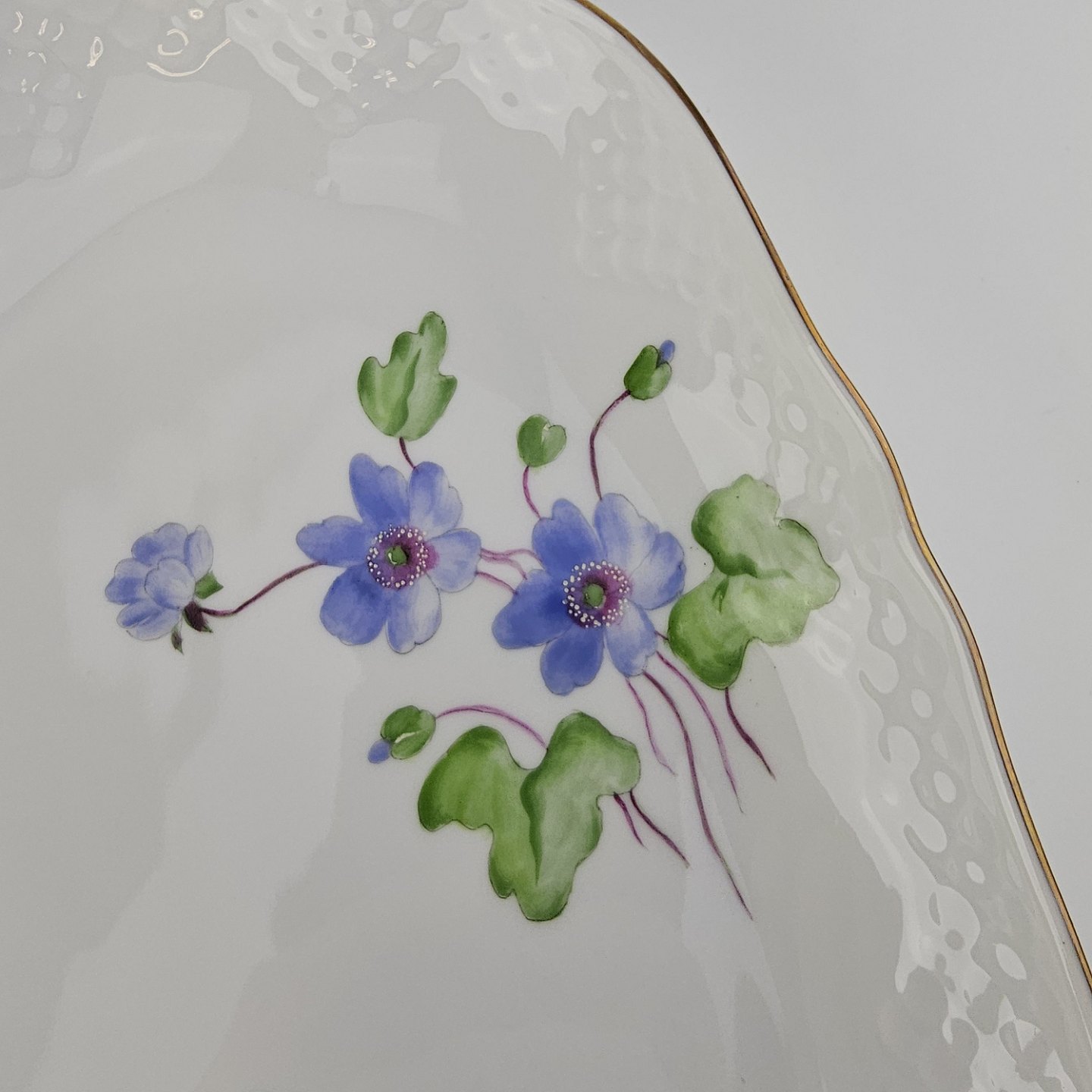 Antonius er af hvidt porcelæn med skælform dekoreret med håndmalede blå anemoner og guldkant. Også kendt under navnet Blå Anemone.
