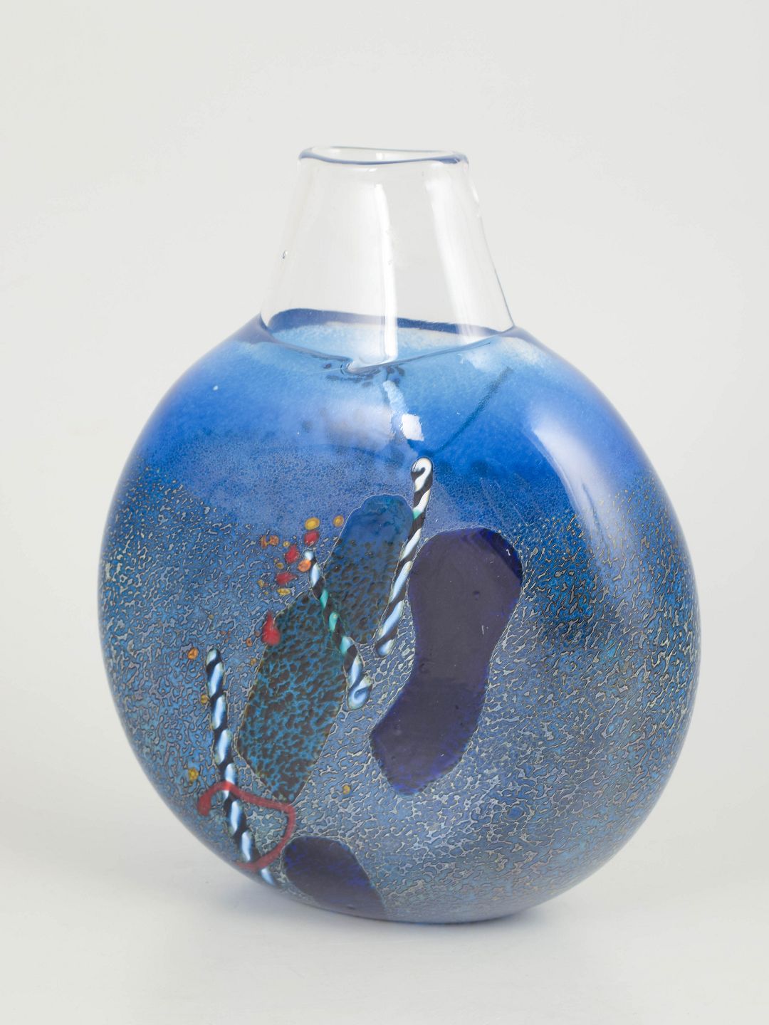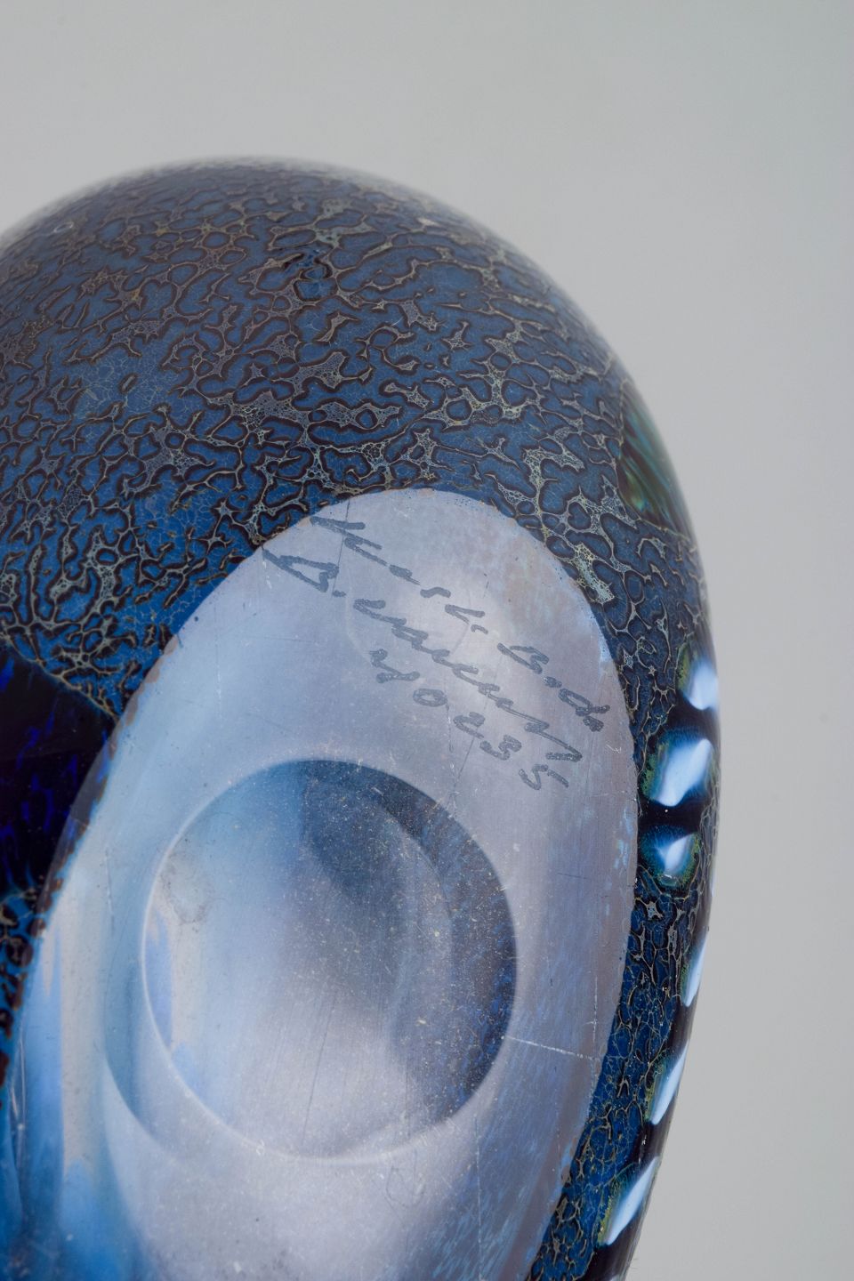 Organisk formet kunstglasvase i mundblæst blåligt glas med indsmeltede dekorative elementer og let krakeleret overfladestruktur. Modellenummer 40235 er indridset under bunden sammen med signatur.