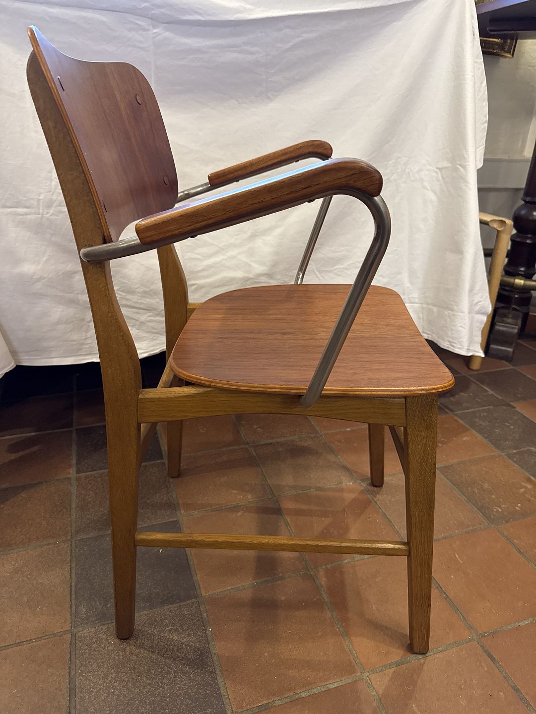 Ib Kofod Larsen armstol med stel i eg samt sæde og ryg i teak og metal. Fremstillet ca. 1960’erne