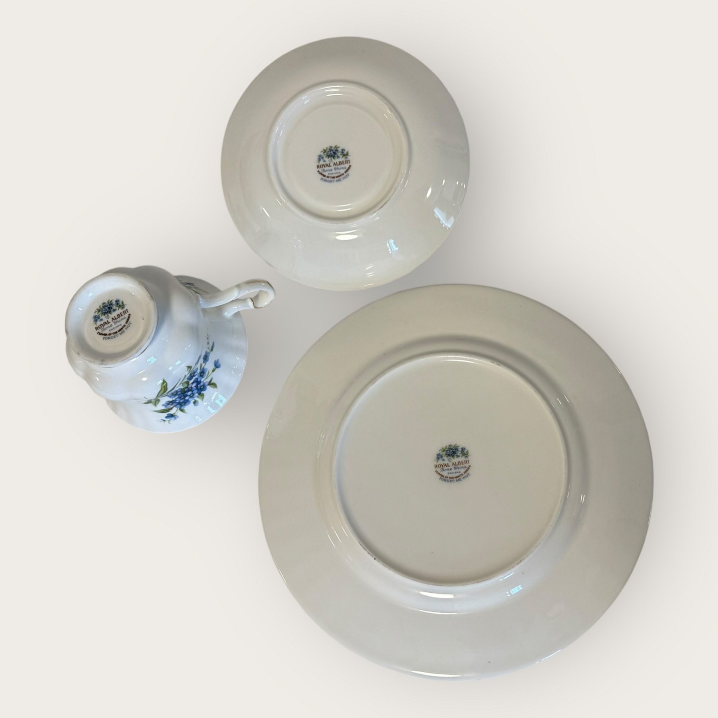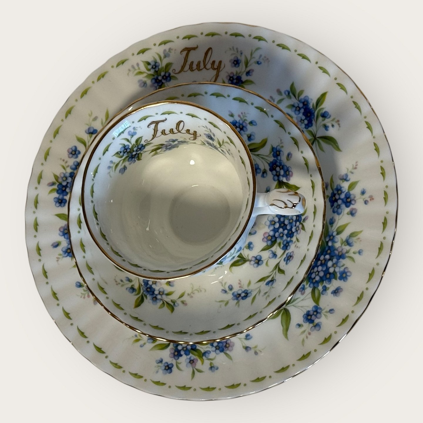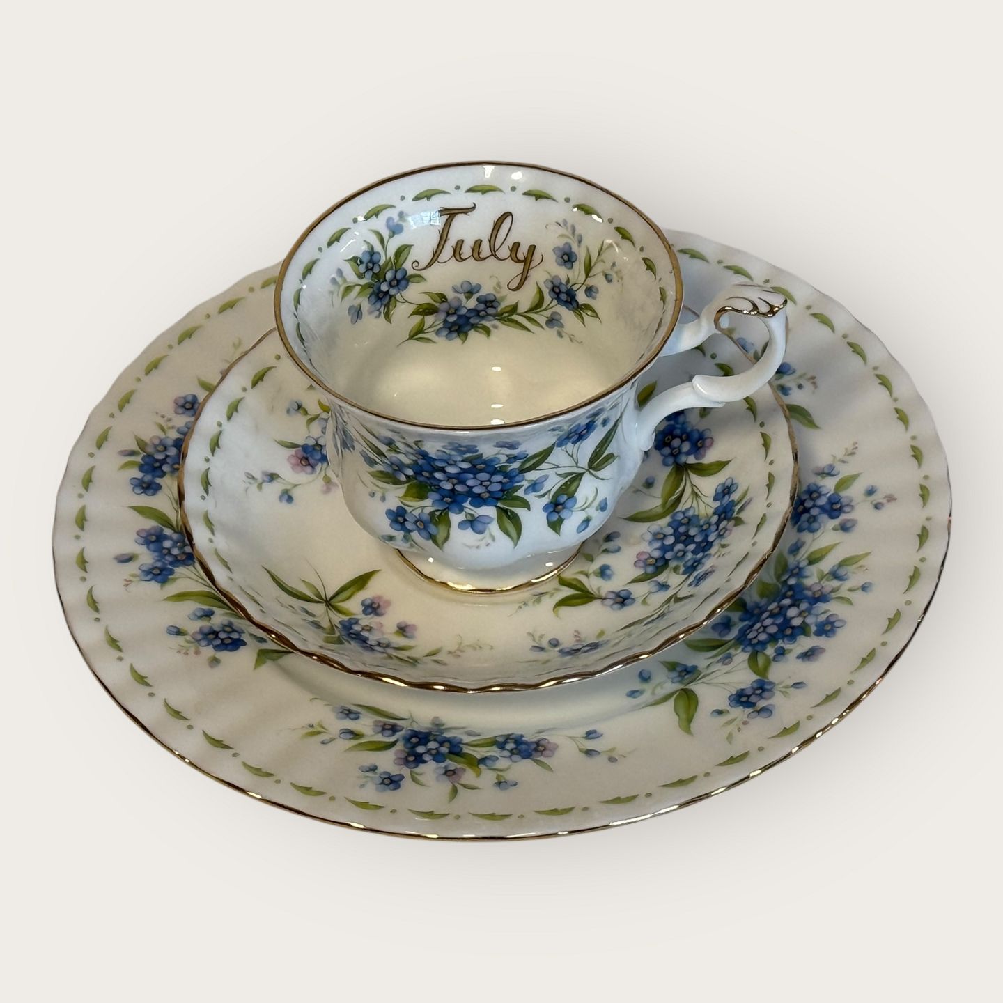 Royal Albert, Flower of the month, Trio set with cup, saucer and cake plate, plate has a diameter of 20.5cm, cup has a diameter of 9cm and a height of 7cm *In perfect condition*