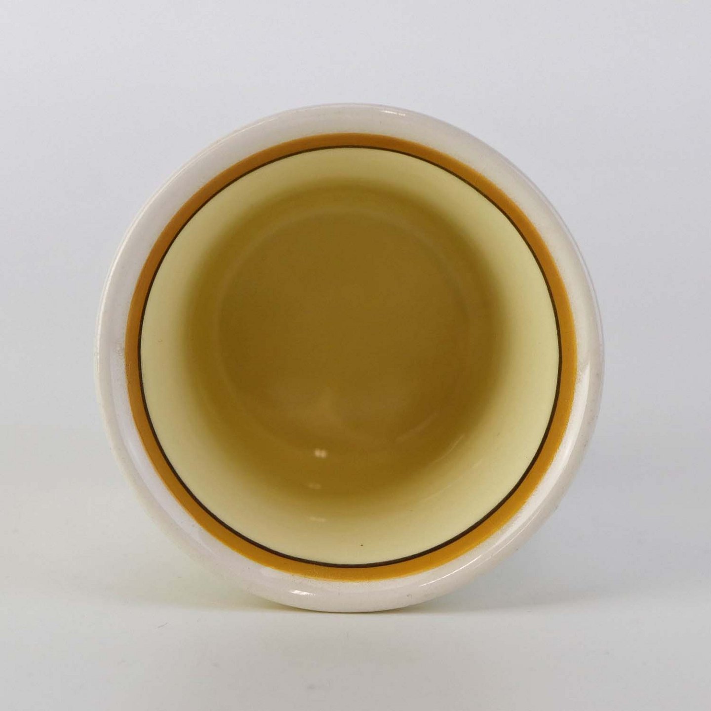 Glat fajancestel med dekoration i brune og gule farver på lys bagggrund med mørkebrun streg.