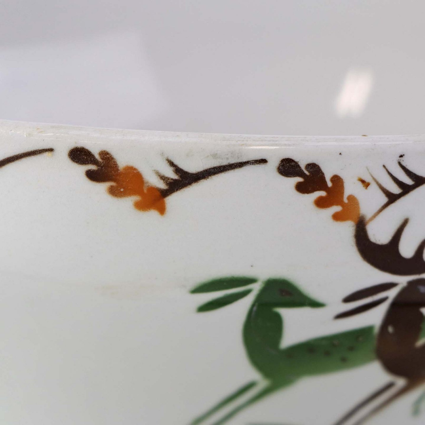 Fajancestel i stelform C med dekoration af grøn og brun hjort på lys baggrund med kantbort af blade i brune nuancer.