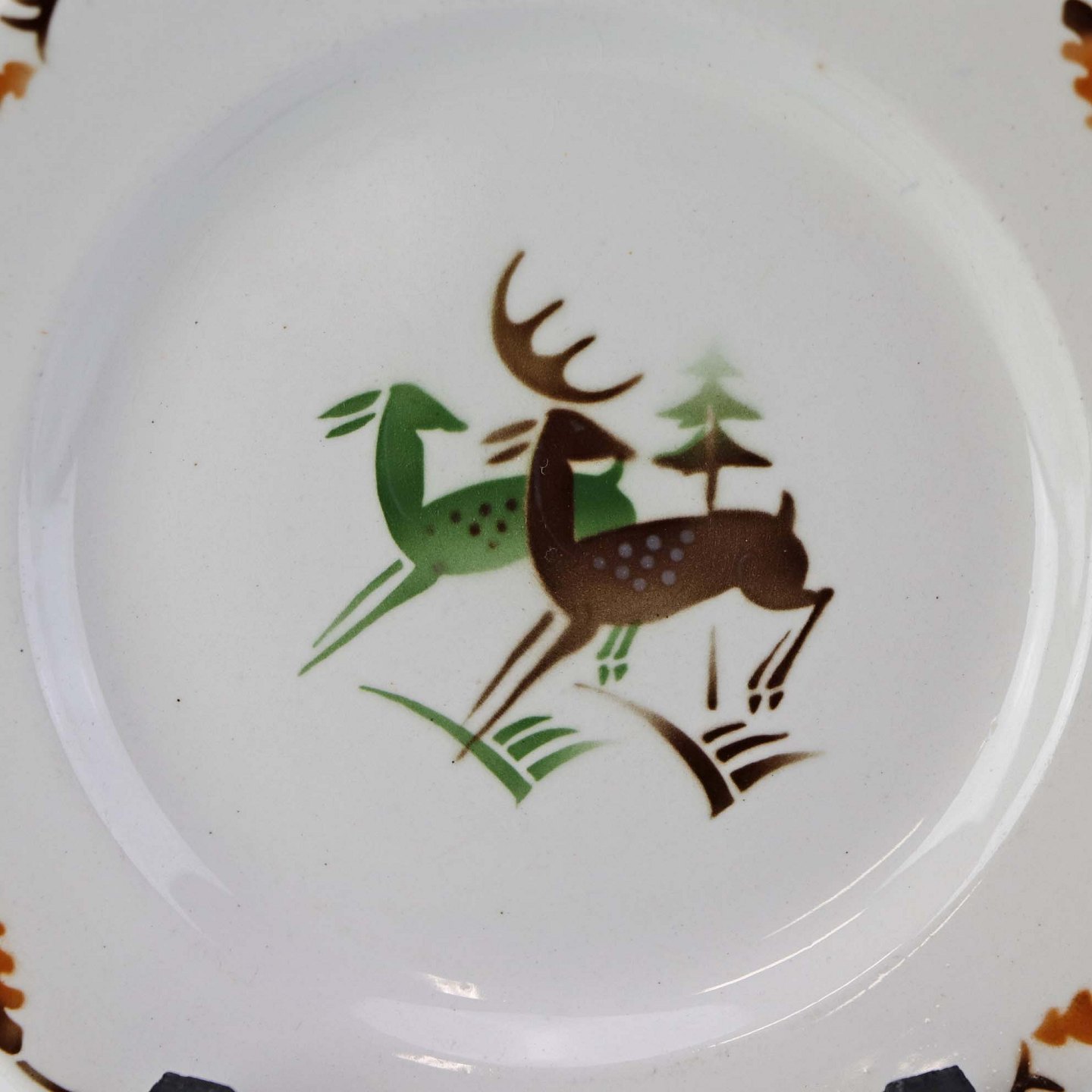 Fajancestel i stelform C med dekoration af grøn og brun hjort på lys baggrund med kantbort af blade i brune nuancer.