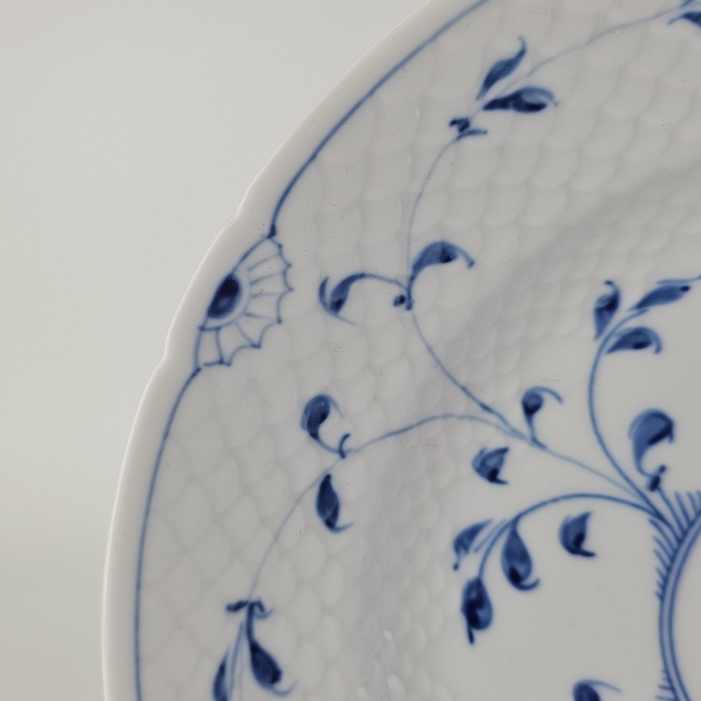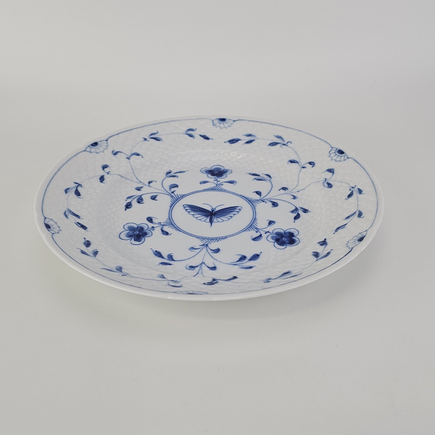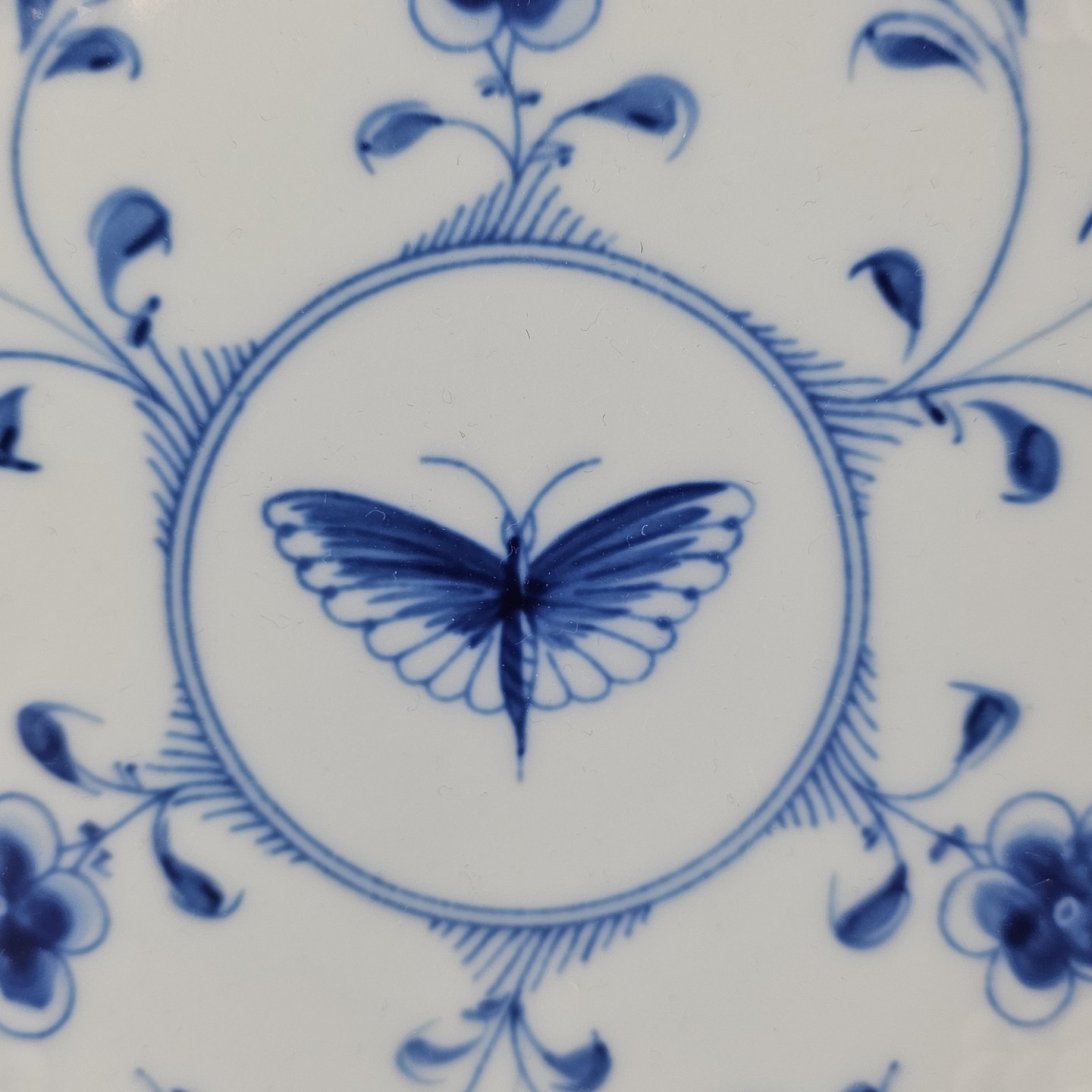 Service i hvidt skælformet porcelæn med blå motiver af blomster og sommerfugle