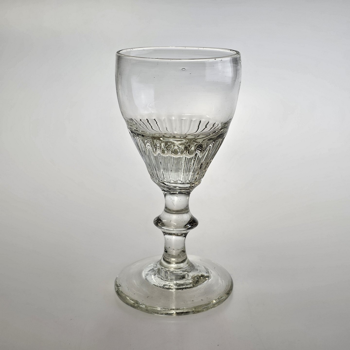 Håndblæst vinglas med riflet, tøndeformet kumme på stilk med knap