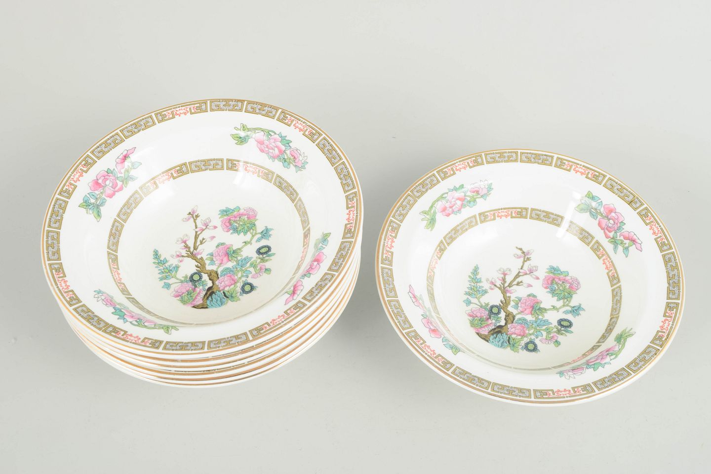 Dekorerede porcelænsskåle med blomsterdekoration og geometrisk bort i guldtoner. Mærket i bunden “Made in England”.