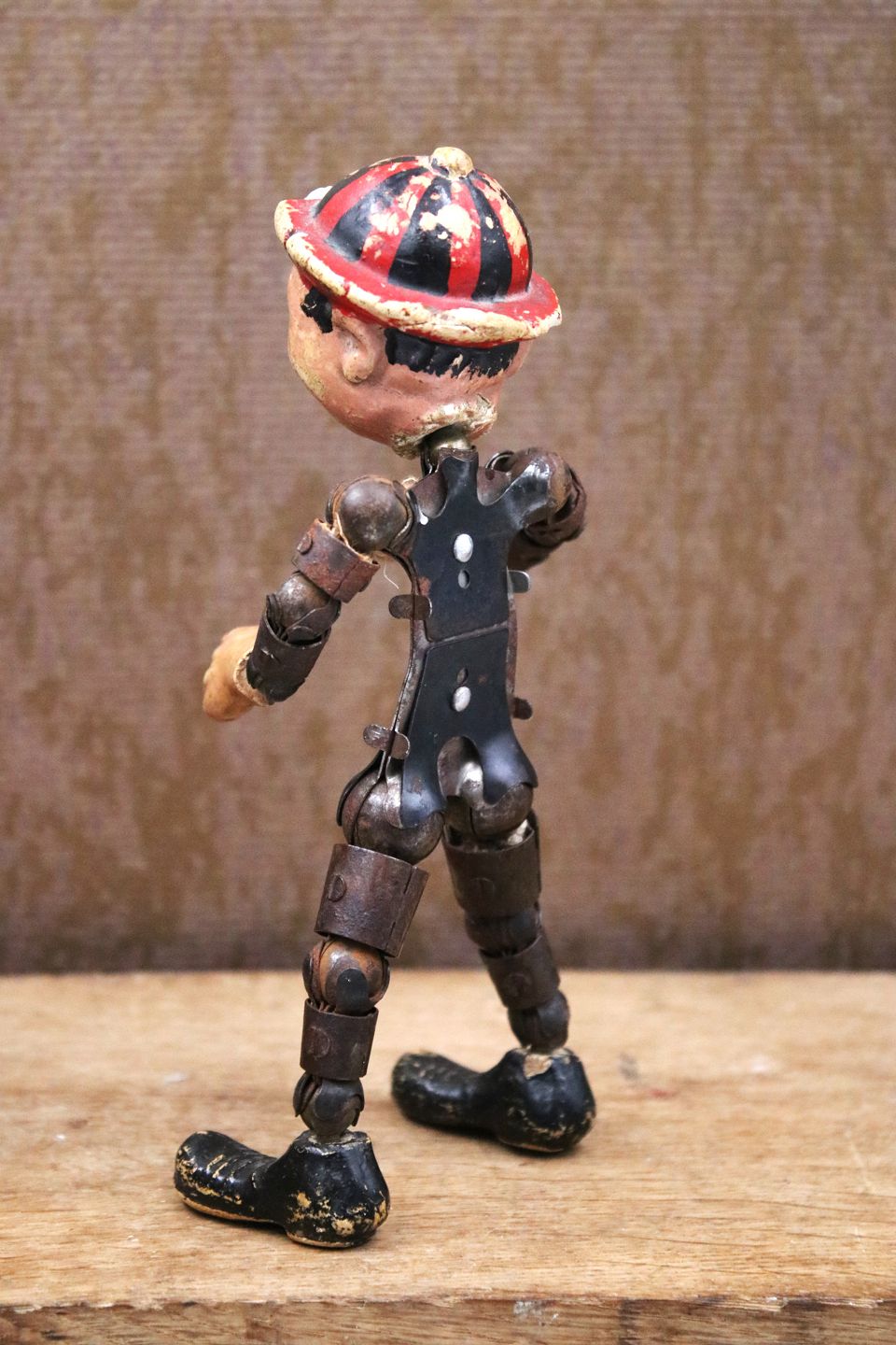 Krop , arme og ben er i metal som kan bøjes , hoved og hænder er i bemalet gips ( har lidt afslag ) Højde: 16,5cm.