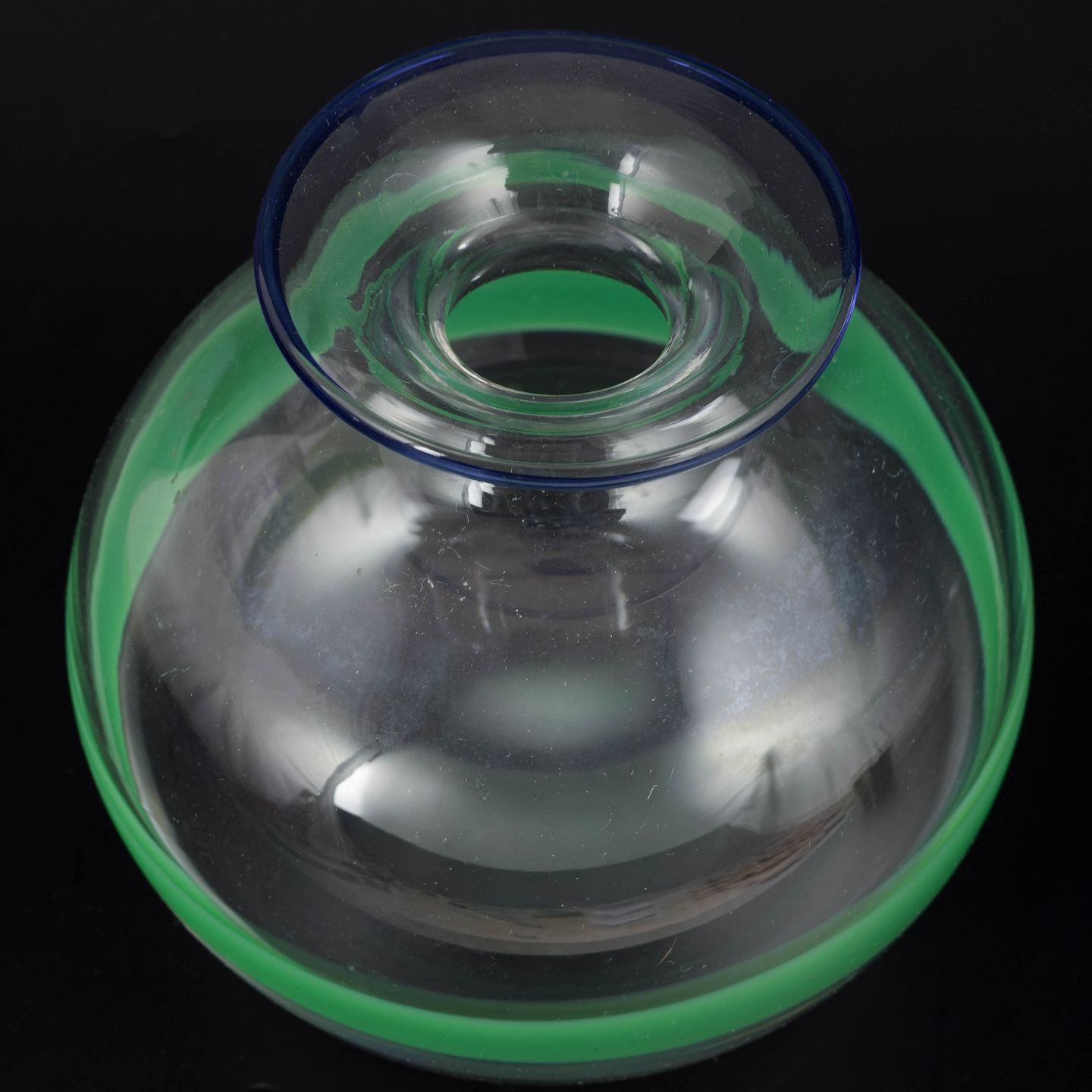 Rund, blæst kunstglasvase i klart glas med bred grøn horisontal bånddekoration og blå markeret munding.