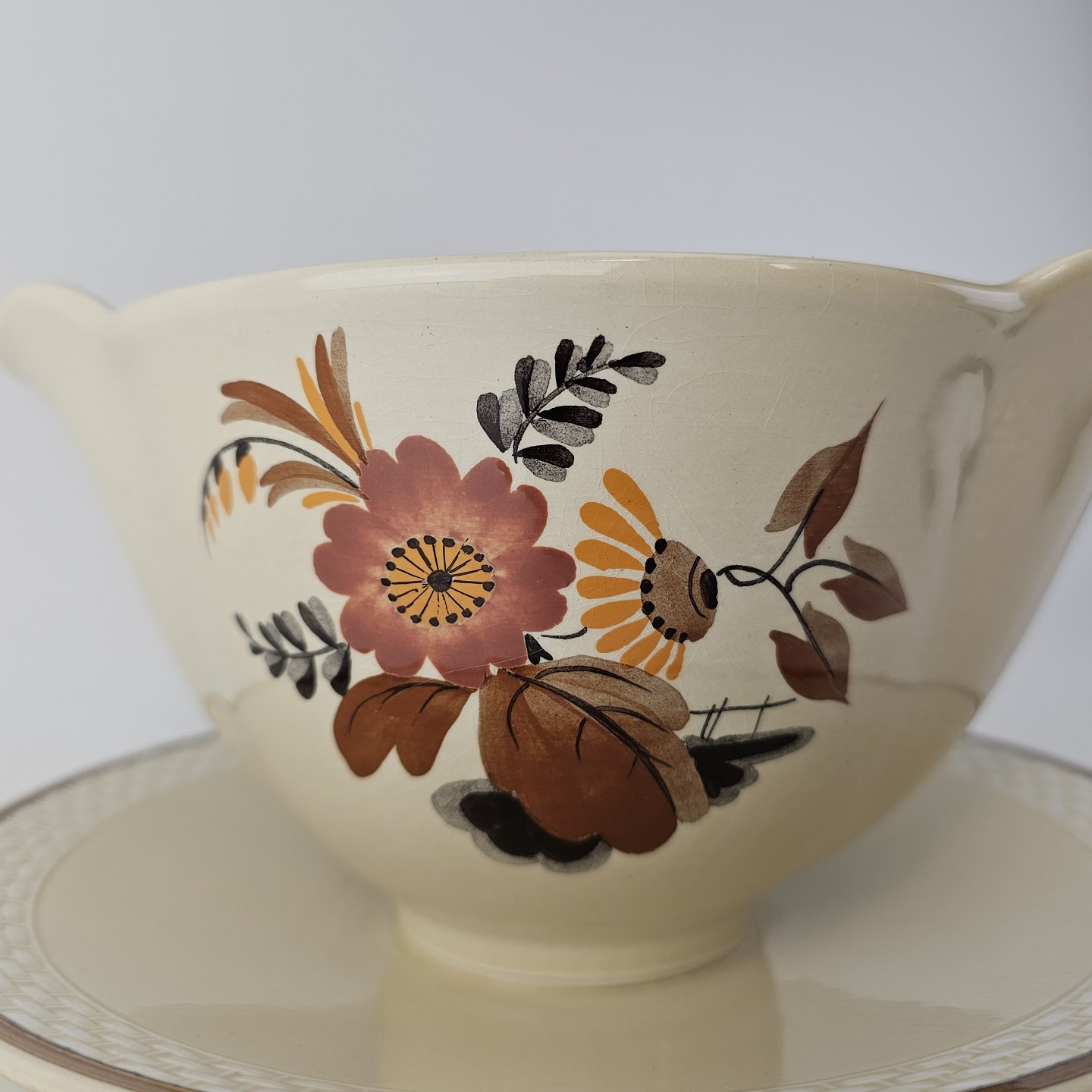 Knud er cremefarvet fajance dekoreret med flettet kant og brune og orange blomster. Stellet blev produceret i år 1934-1963.