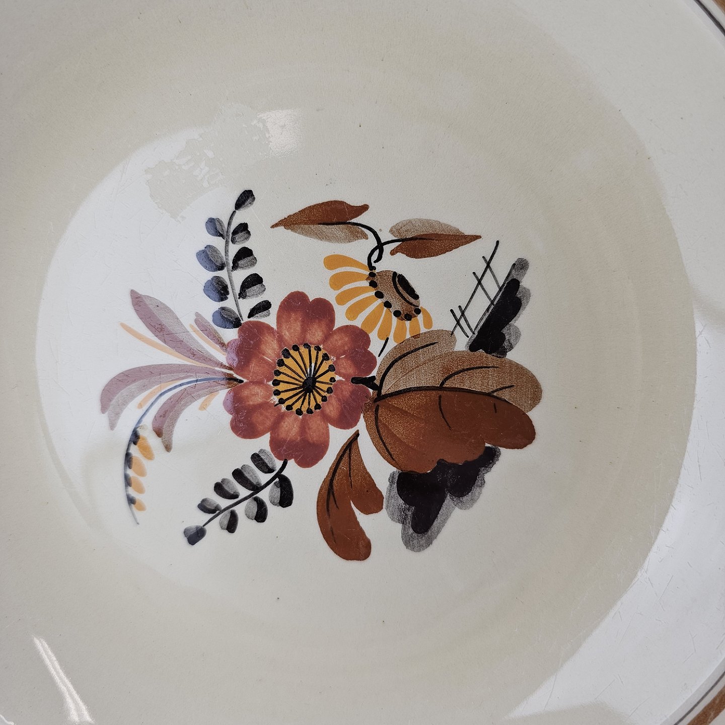 Knud er cremefarvet fajance dekoreret med flettet kant og brune og orange blomster. Stellet blev produceret i år 1934-1963.