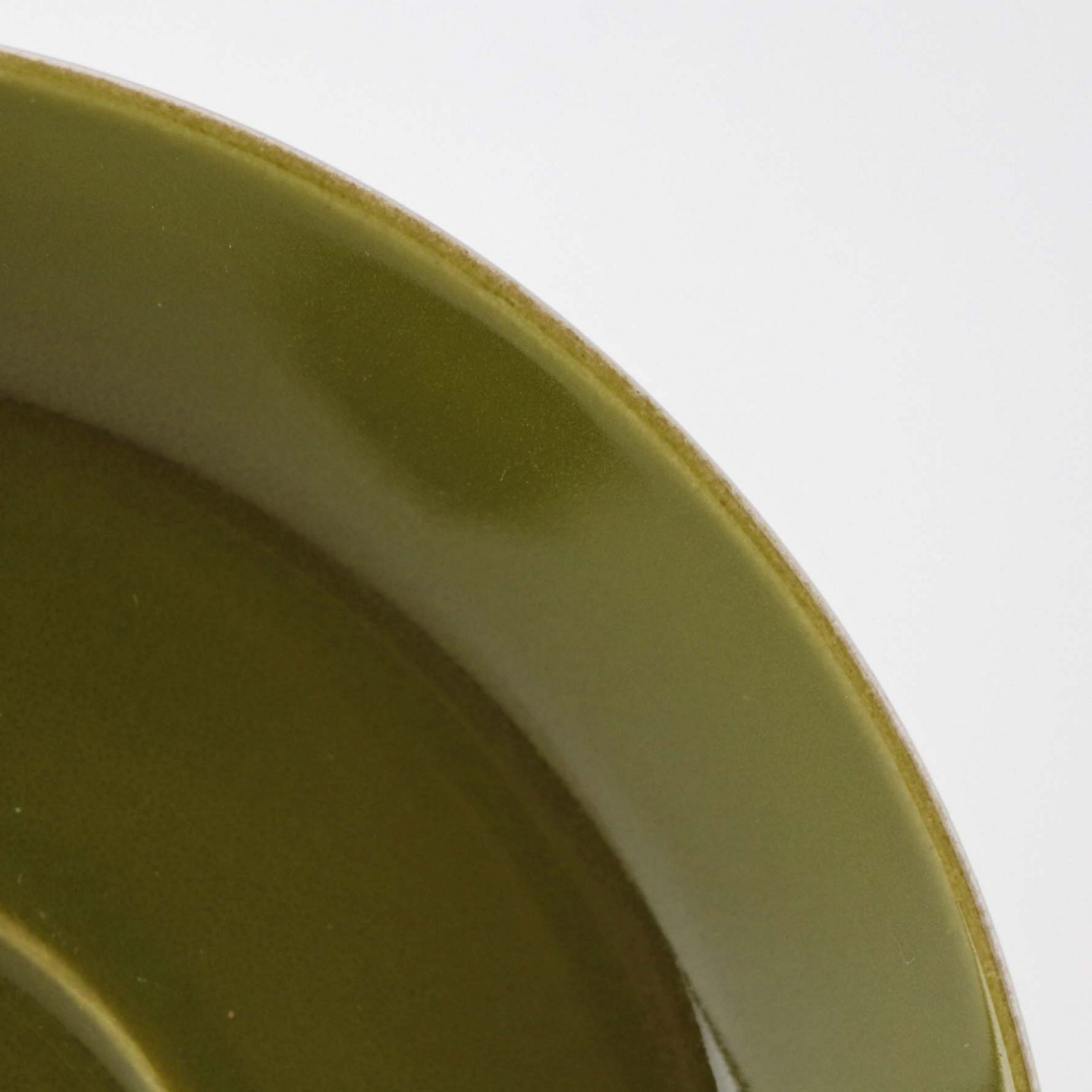 Flaskegrøn fajancestel i Prunella stelform med inderside i hvid glasur og tynd rød kant stribe.