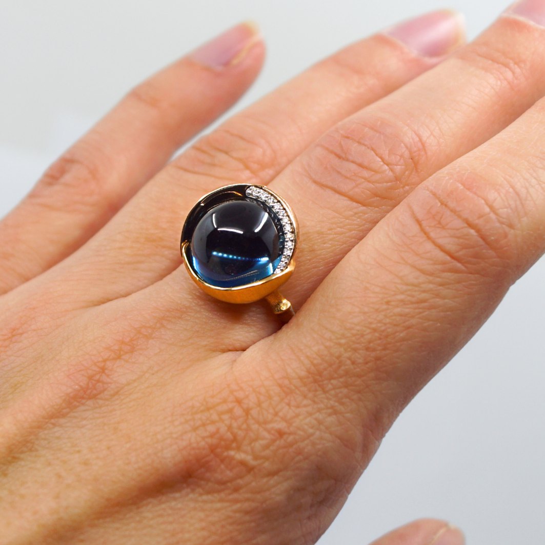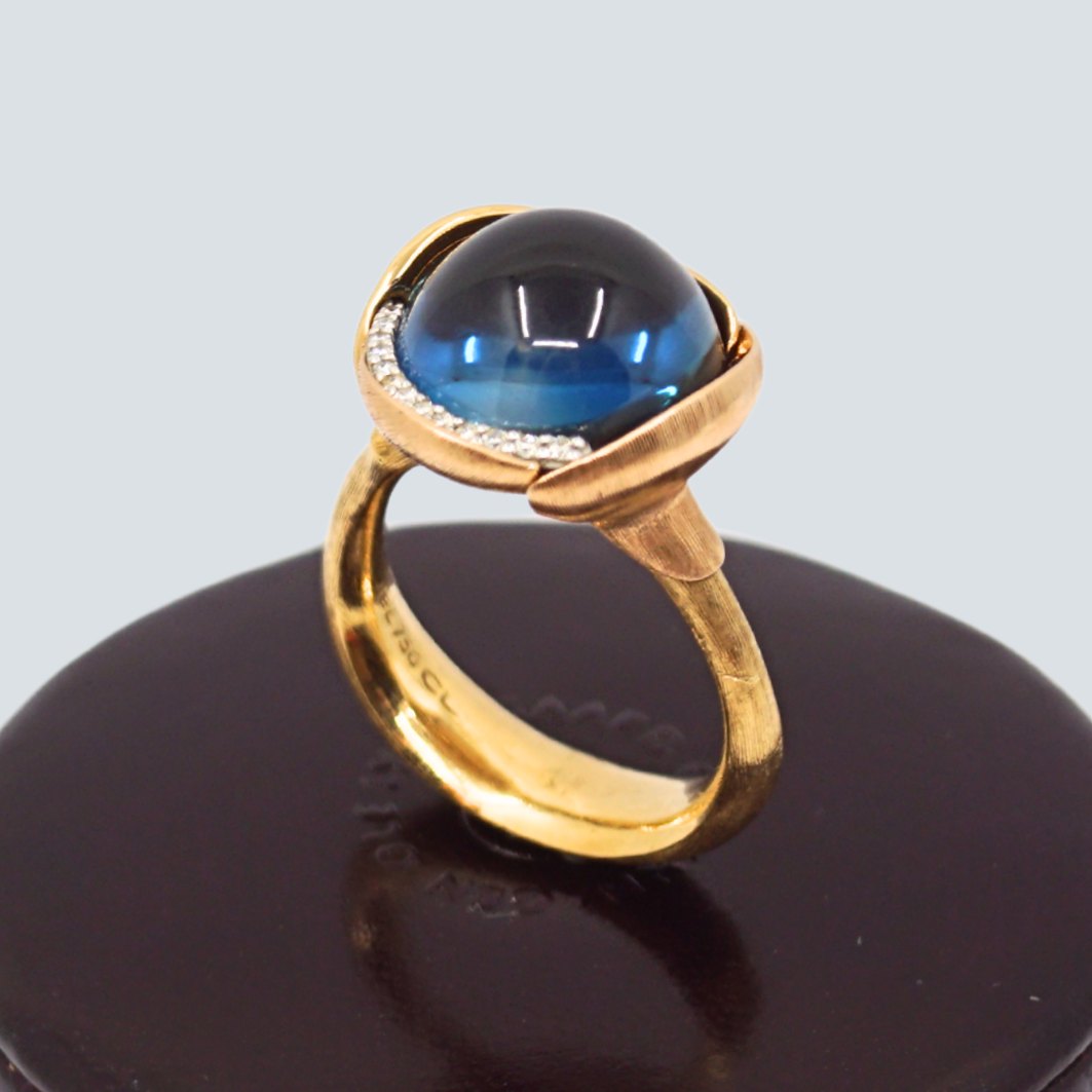 Charlotte Lynggaard for Ole Lynggaard; Lotus ring nr. 3 i 18 kt. guld, med blå topas og 13 brillantslebne diamanter. To af de omkransede blade i rosaguld.