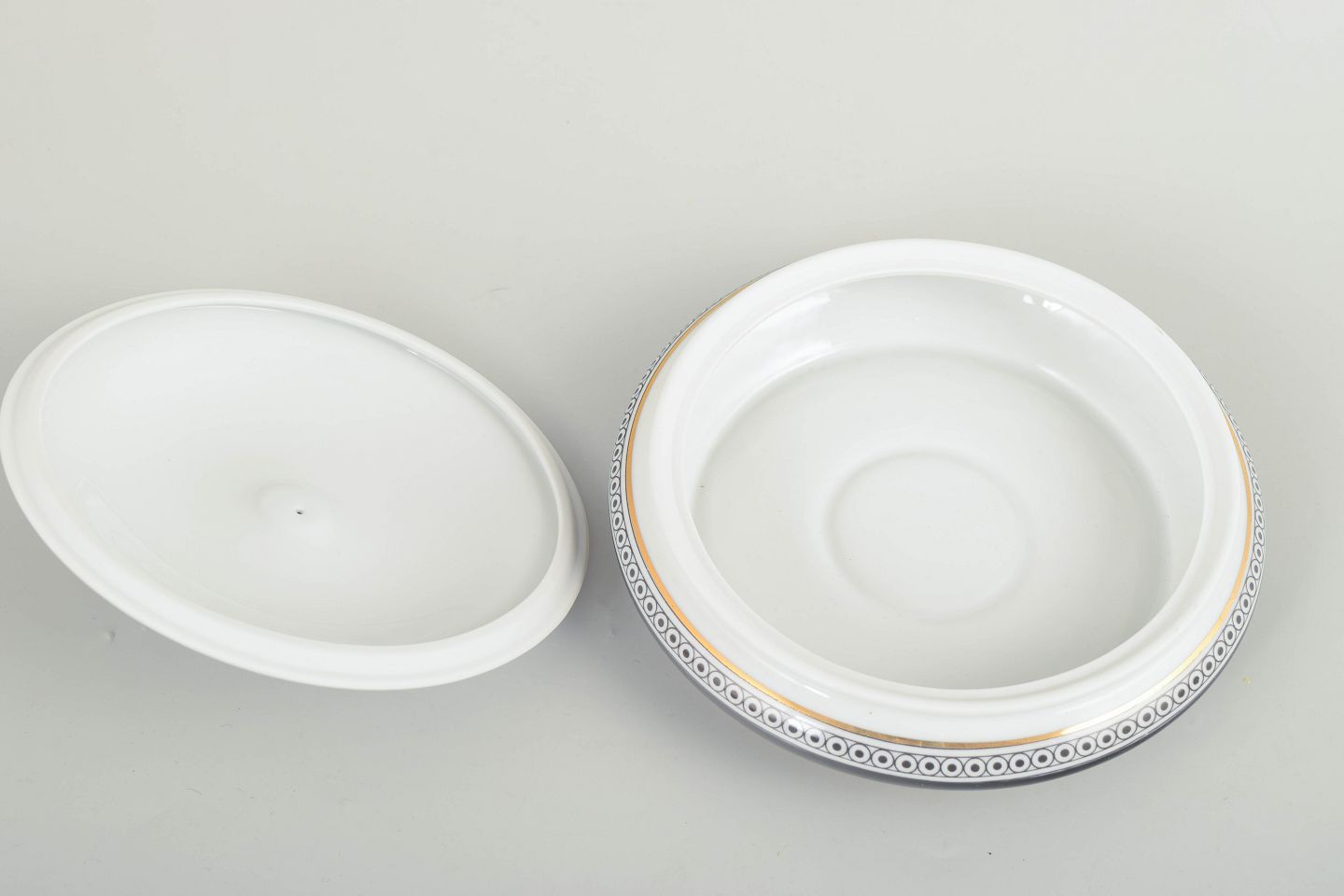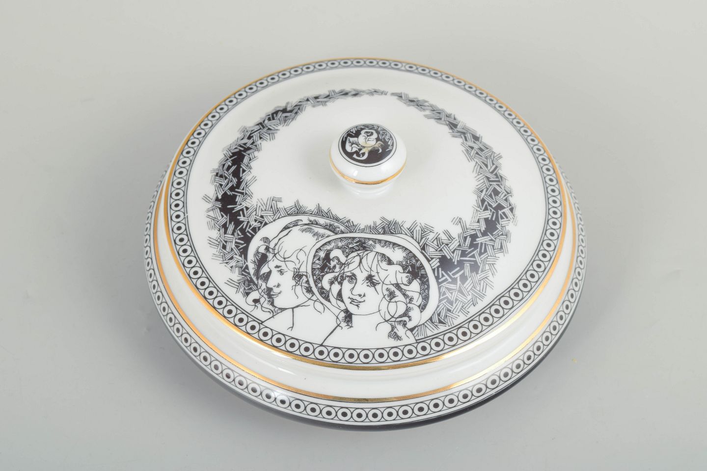Rund skål med låg i hvidglaseret porcelæn med sort dekorationsbort og figurmotiv på låget. Fremstillet hos Hollóháza Porcelænsmanufaktur.