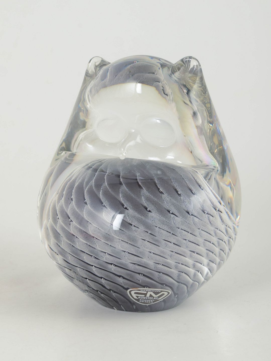 Dekorativ ugle i massivt kunstglas med klar overdel og indre mønster i grå og violette nuancer. Udført med spiralformet struktur i korpus og blødt modelleret hoved. Med originalt mærkat fra FM Konstglas, Ronneby.