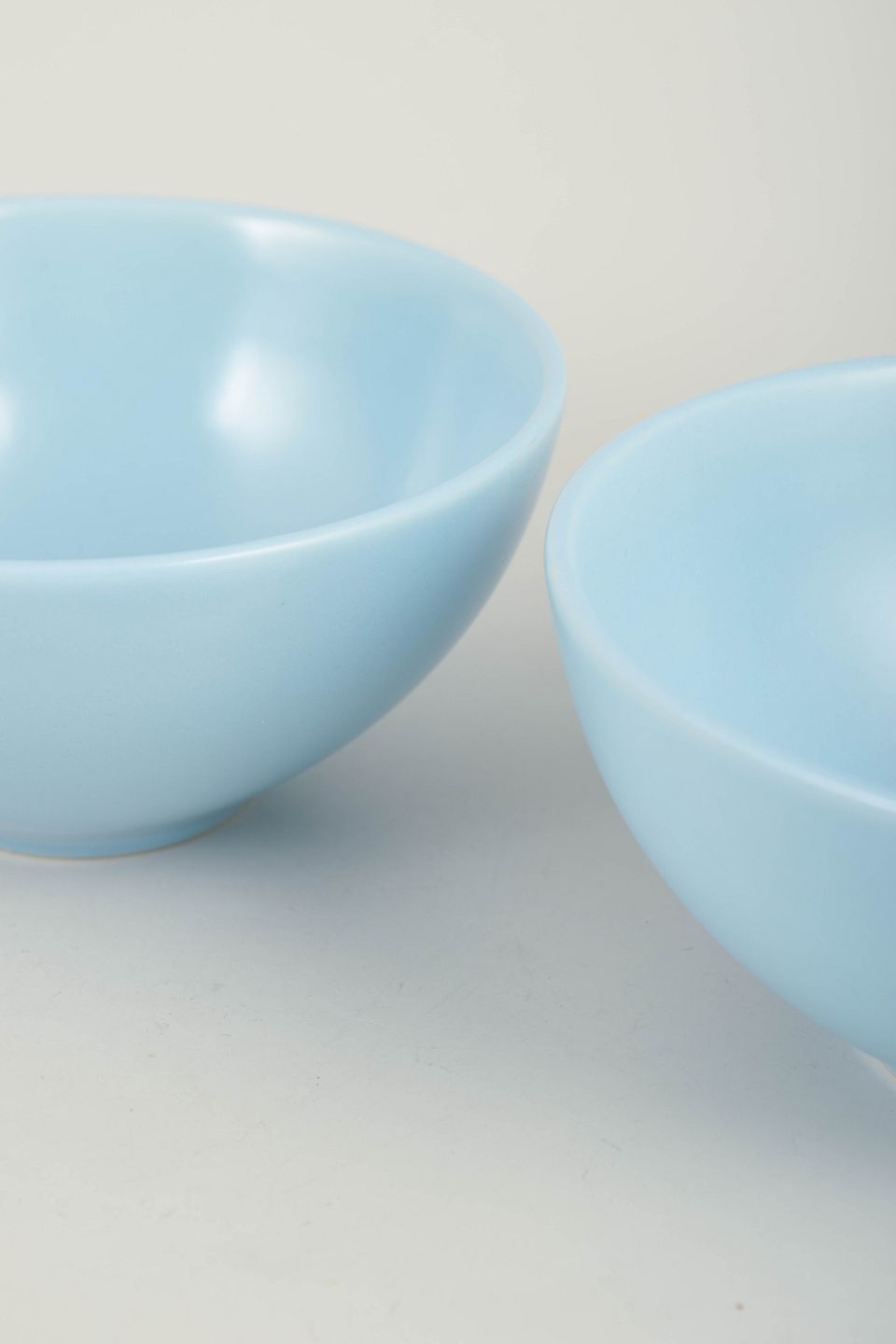 Runde skåle i stentøj med ensartet turkis glasur og let konisk form.