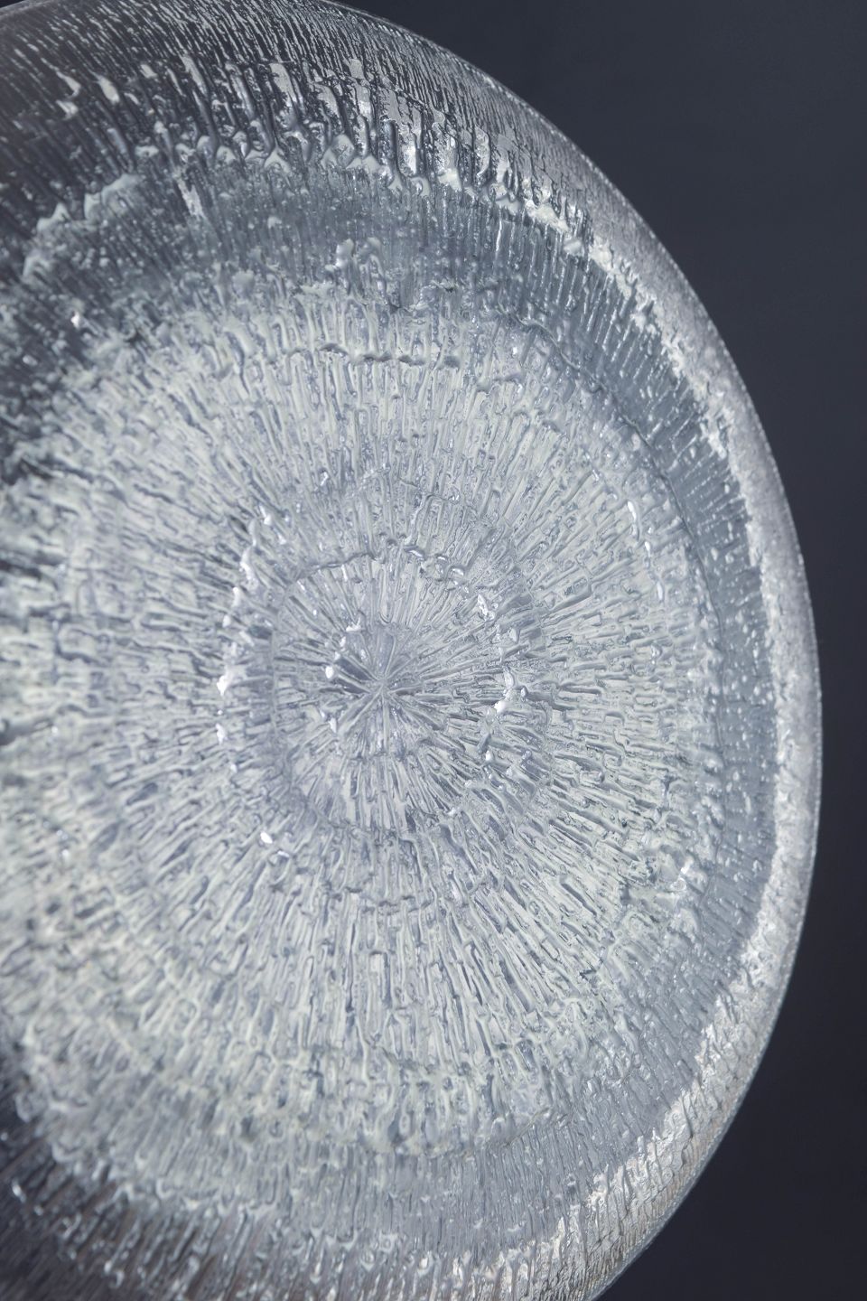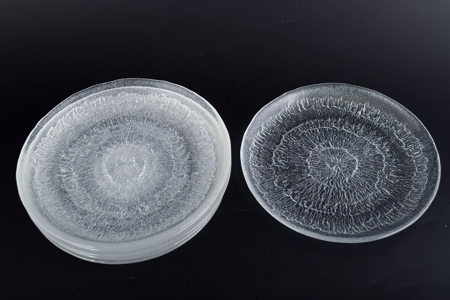 Sæt på seks tallerkener i presset klart glas fra serien Ultima Thule med karakteristisk, kraftigt struktureret overflade inspireret af smeltende is og arktiske landskaber. Uden mærkning.