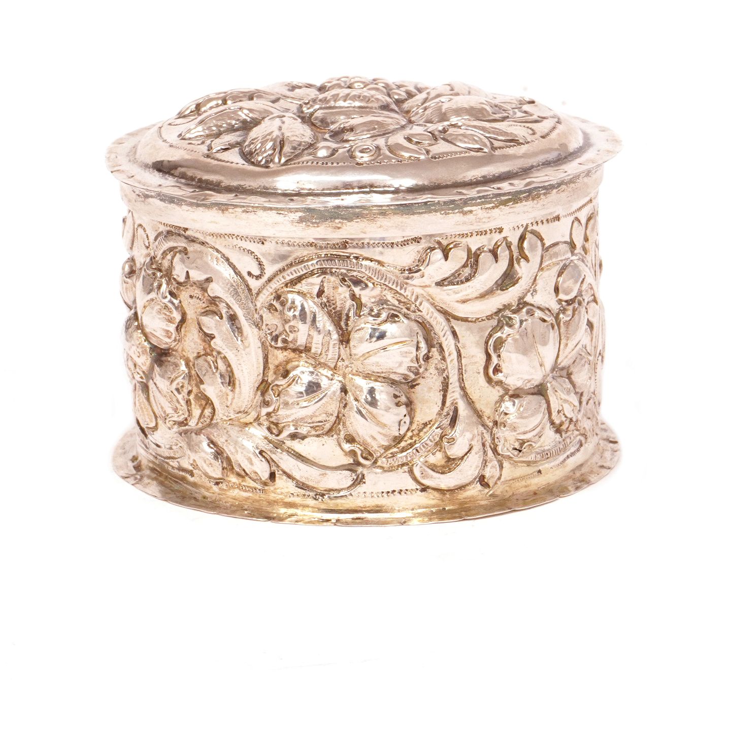 Drevet barok oblatdåse i sølv af Thore Sørensen, Aalborg, 1704-32. H: 6cm. D: 8,6cm