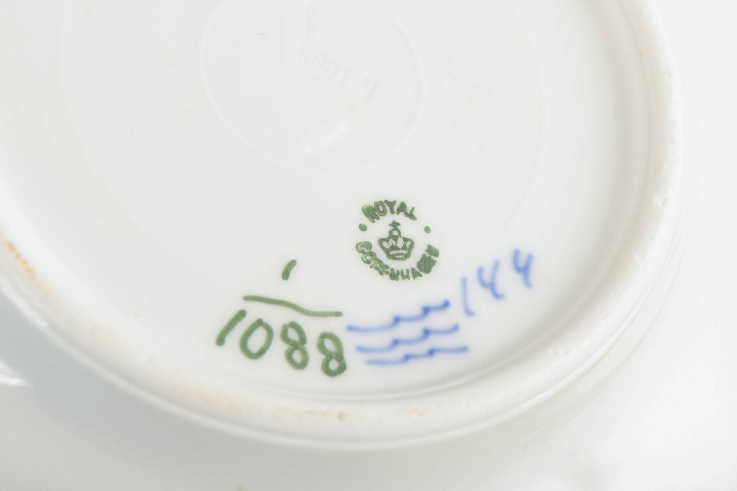 Royal Copenhagen blev grundlagt i 1775 i København under kongelig bevilling. Fabrikken er internationalt anerkendt for sit håndmalede porcelæn og sit høje kunstneriske niveau. Musselmalet Helblonde er en videreudvikling af det klassiske Musselmalet Riflet stel og kendetegnes ved sin detaljerede gennembrudte blondekant, der kræver stor håndværksmæssig præcision.