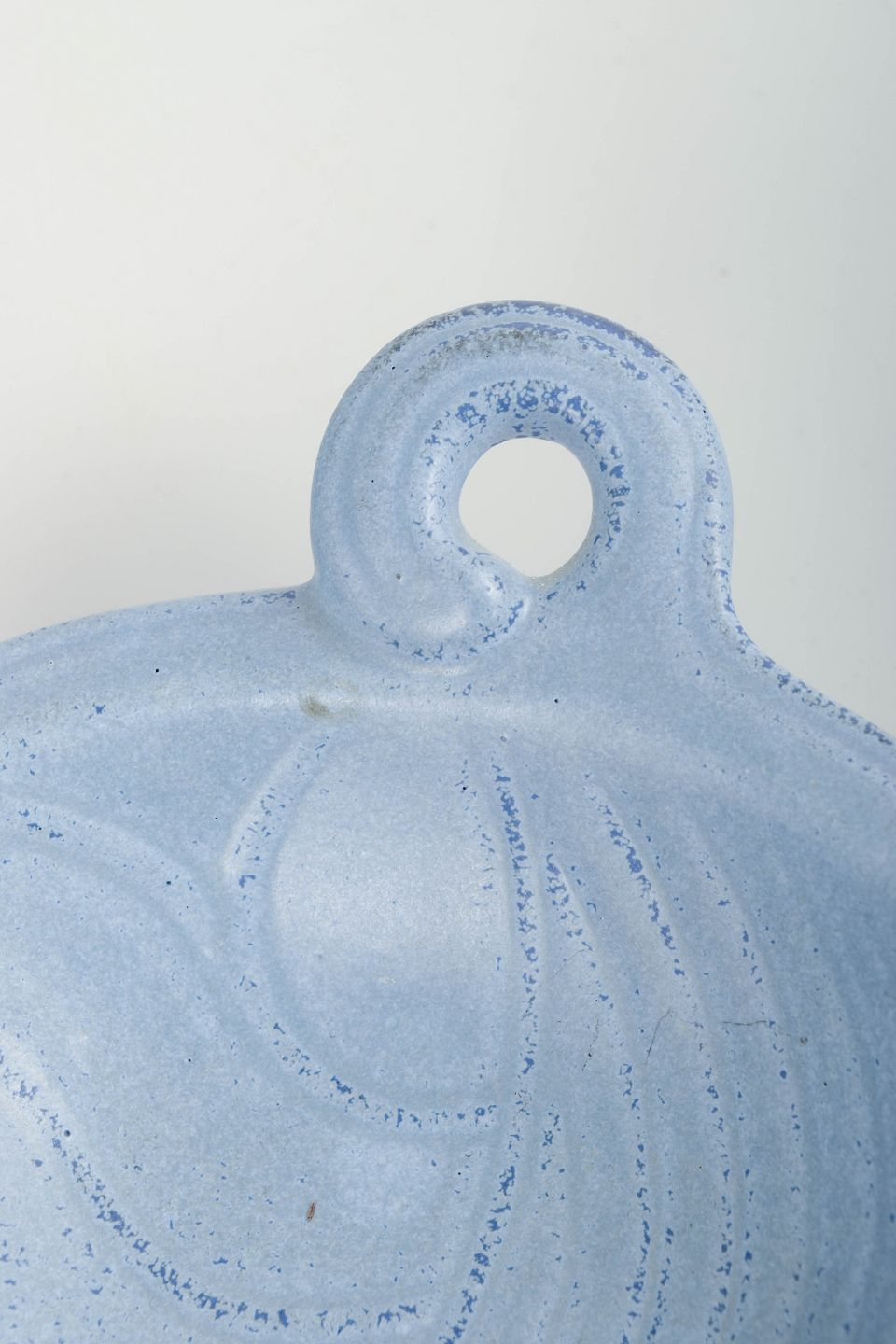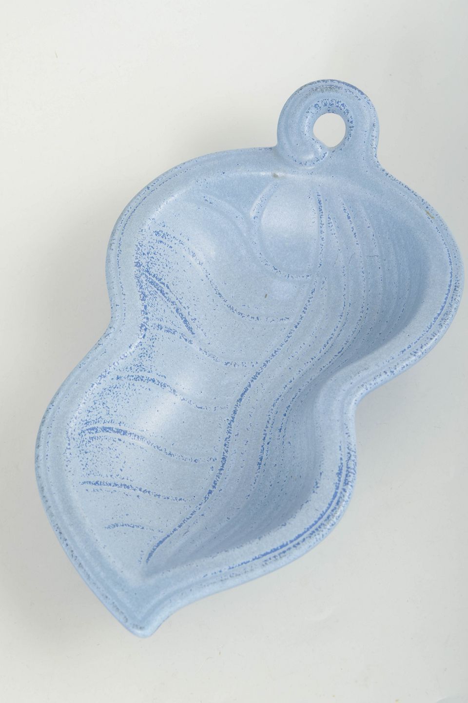 Organisk formet skål i stentøj med integreret hank og svungen, bladlignende form. Dekoreret med lys blå glasur med let struktur, typisk for Gunnar Nylunds formsprog hos Rörstrand i midten af det 20. århundrede. Første sortering.