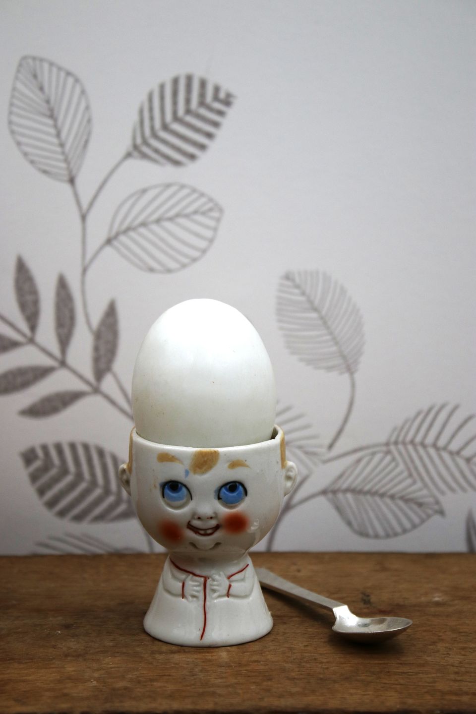 Gammelt æggebægre fra 30érne i porcelæn med bemalet sjovt ansigt.