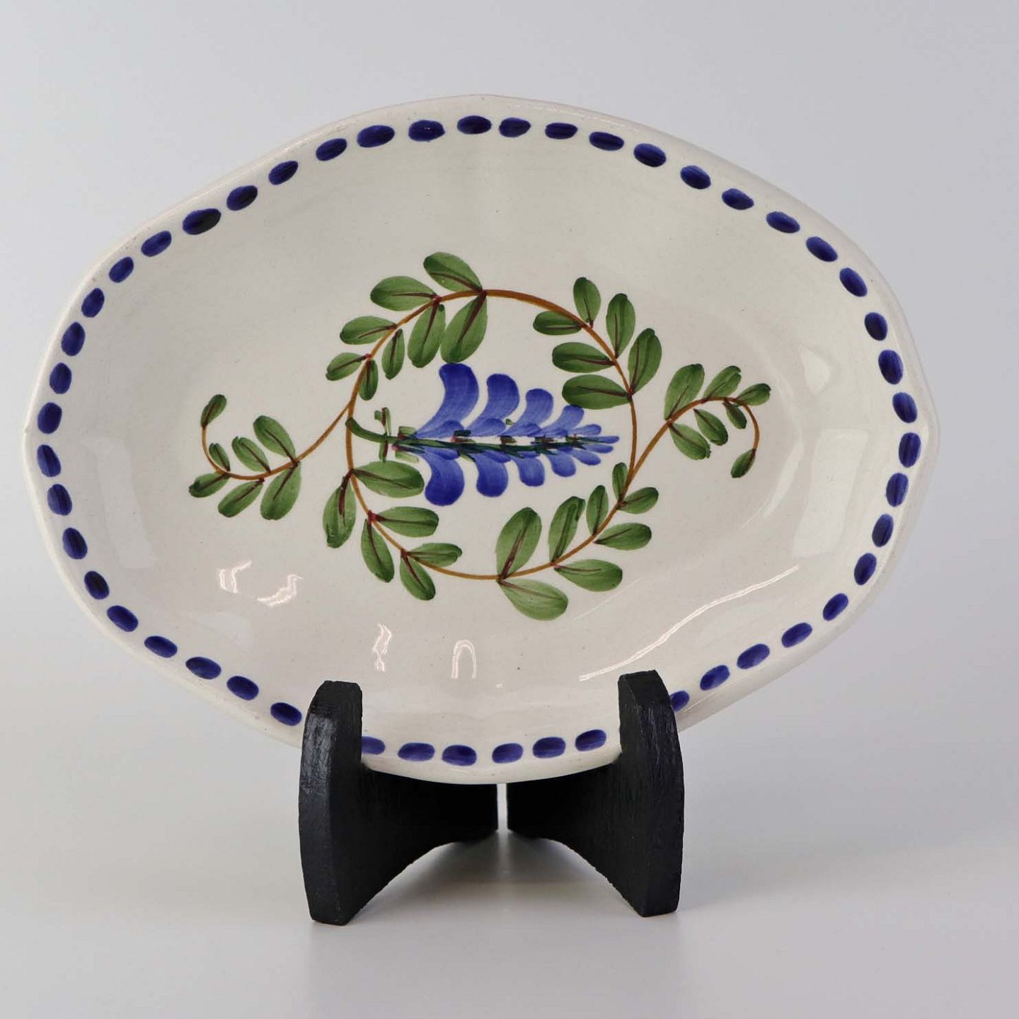Lille ovalt fad med bølget form i fajance fra stellet Blåregn. Stellet er fremstillet i perioden år 1903-1933. Nr. 522/354