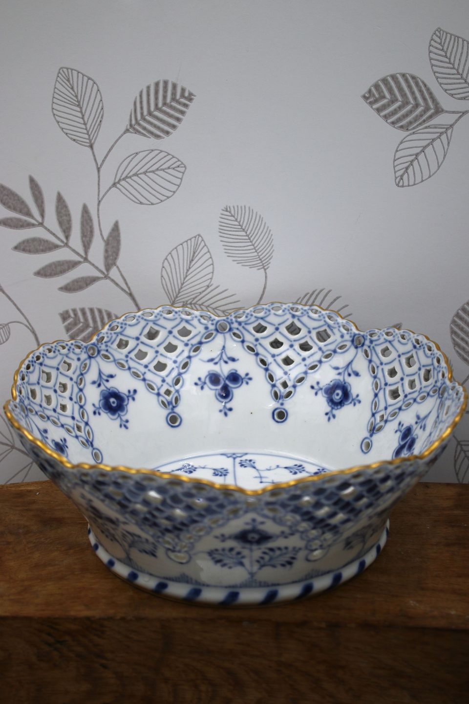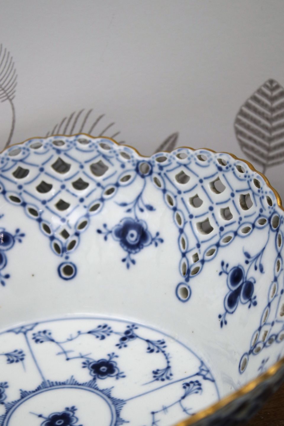 Antik Musselmalet frugtskål med gennembrudt kant og guldkant.