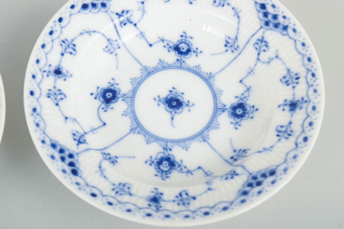Sæt af to små dybe morgenmadstallerkener i håndmalet porcelæn fra Musselmalet Halvblonde med klassisk underglasurdekoration i koboltblå, riflede felter og karakteristisk blondekant. Model 1/569. Første sortering. Fremstillet 1963.