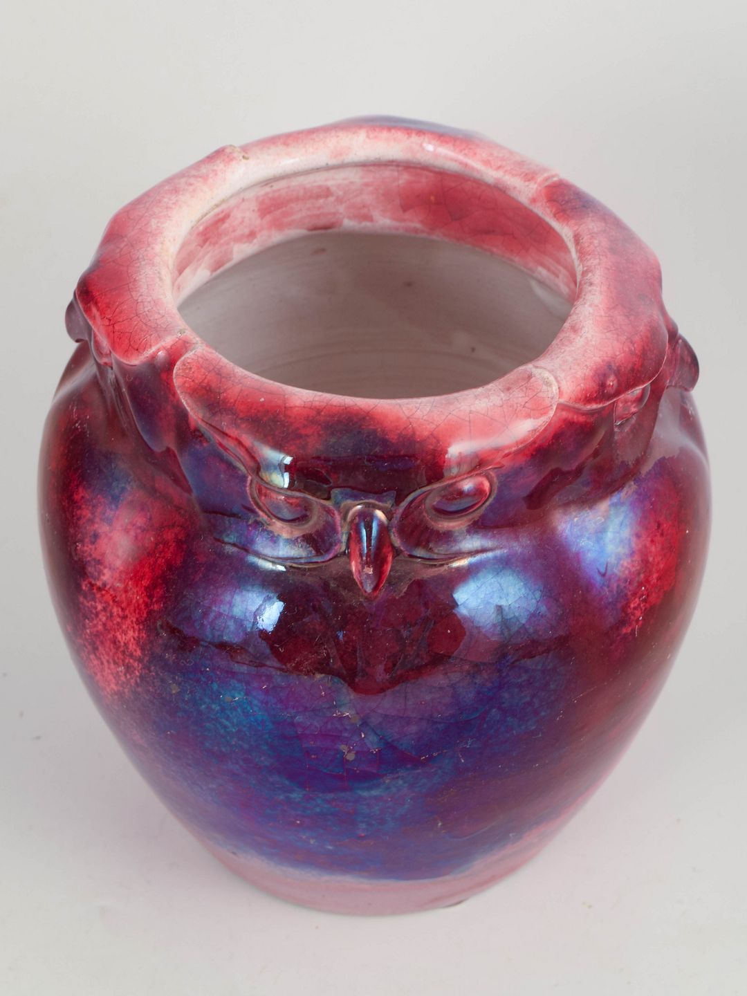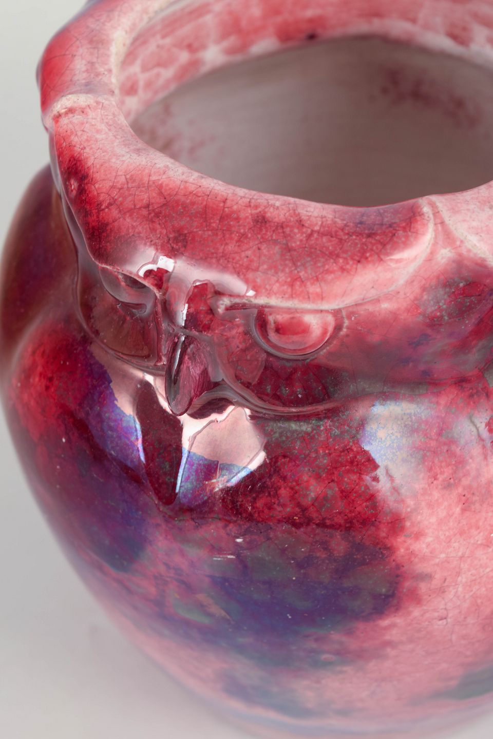 Unika uglevase i kunstkeramik med ugledekoration langs randen i relief og iriserende glasur i røde og blå nuancer. Fremstillet hos Kähler i 1890’erne under Karl Hansen Reistrups kunstneriske ledelse fra 1888.