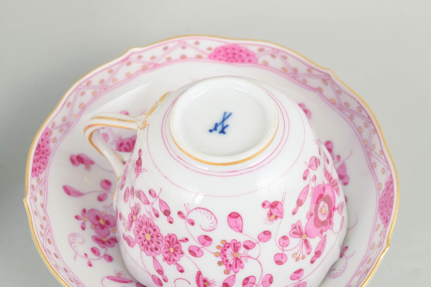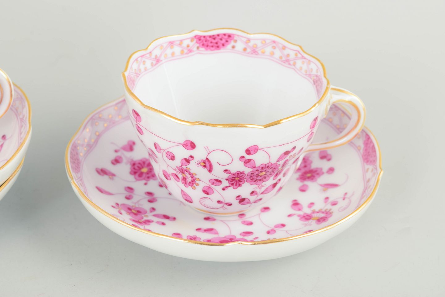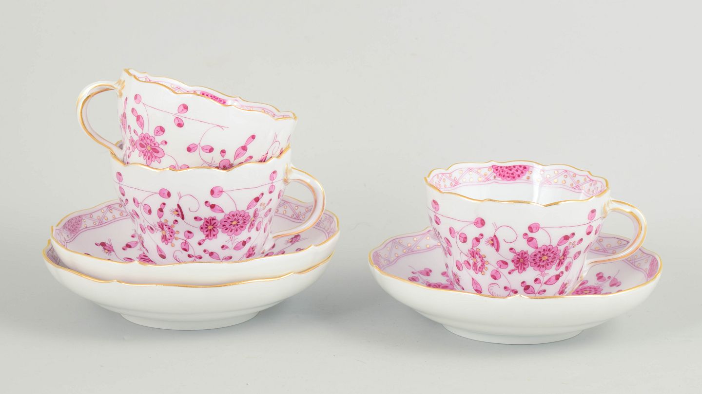 Meissen, "Pink Indian" sæt af tre store kaffekopper med underkopper.