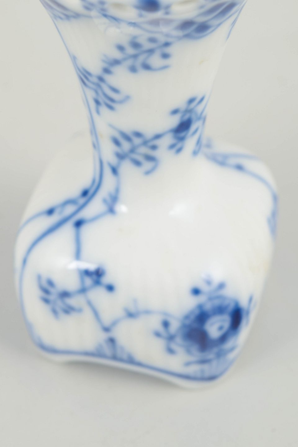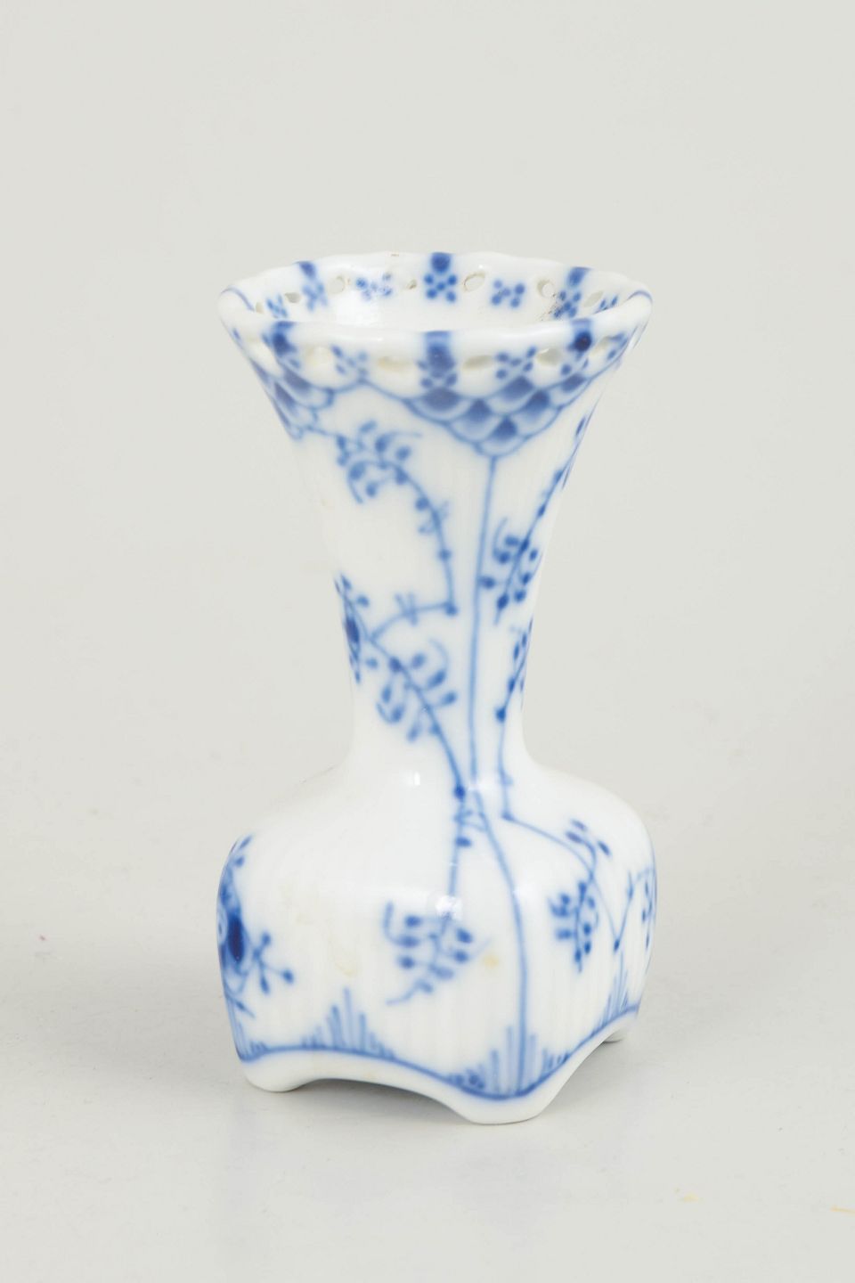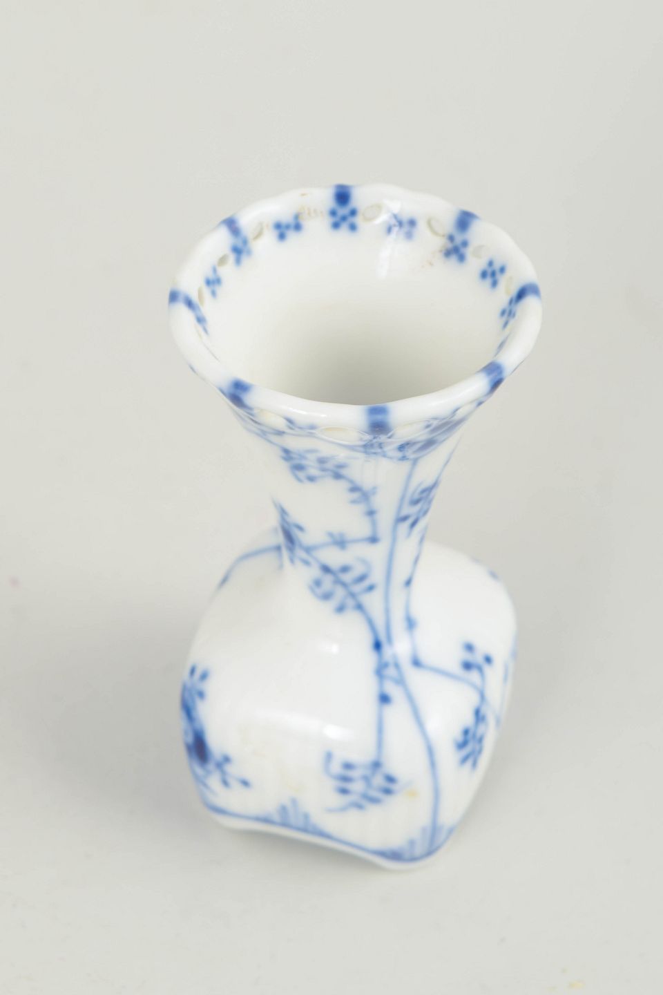 Lille vase i håndmalet porcelæn fra Musselmalet Helblonde med klassisk underglasurdekoration i koboltblå og gennembrudt blondekant.