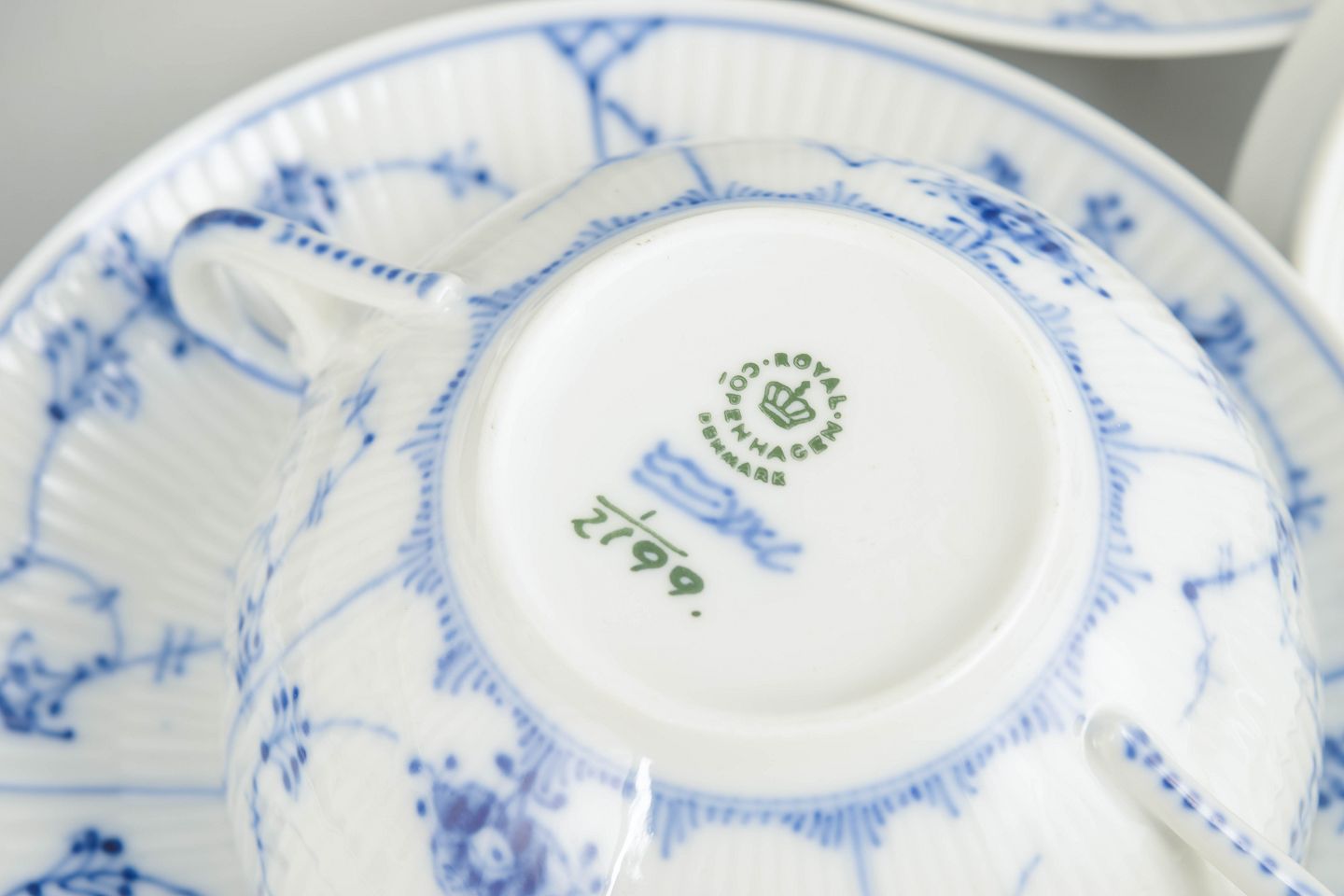 Sæt på fire bouillonkopper med tilhørende underkopper i håndmalet porcelæn fra Musselmalet Riflet med klassisk underglasurdekoration i koboltblå. Model 1/2199. Nogle dele er første sortering, andre er annulleret med én indridset streg under bunden.