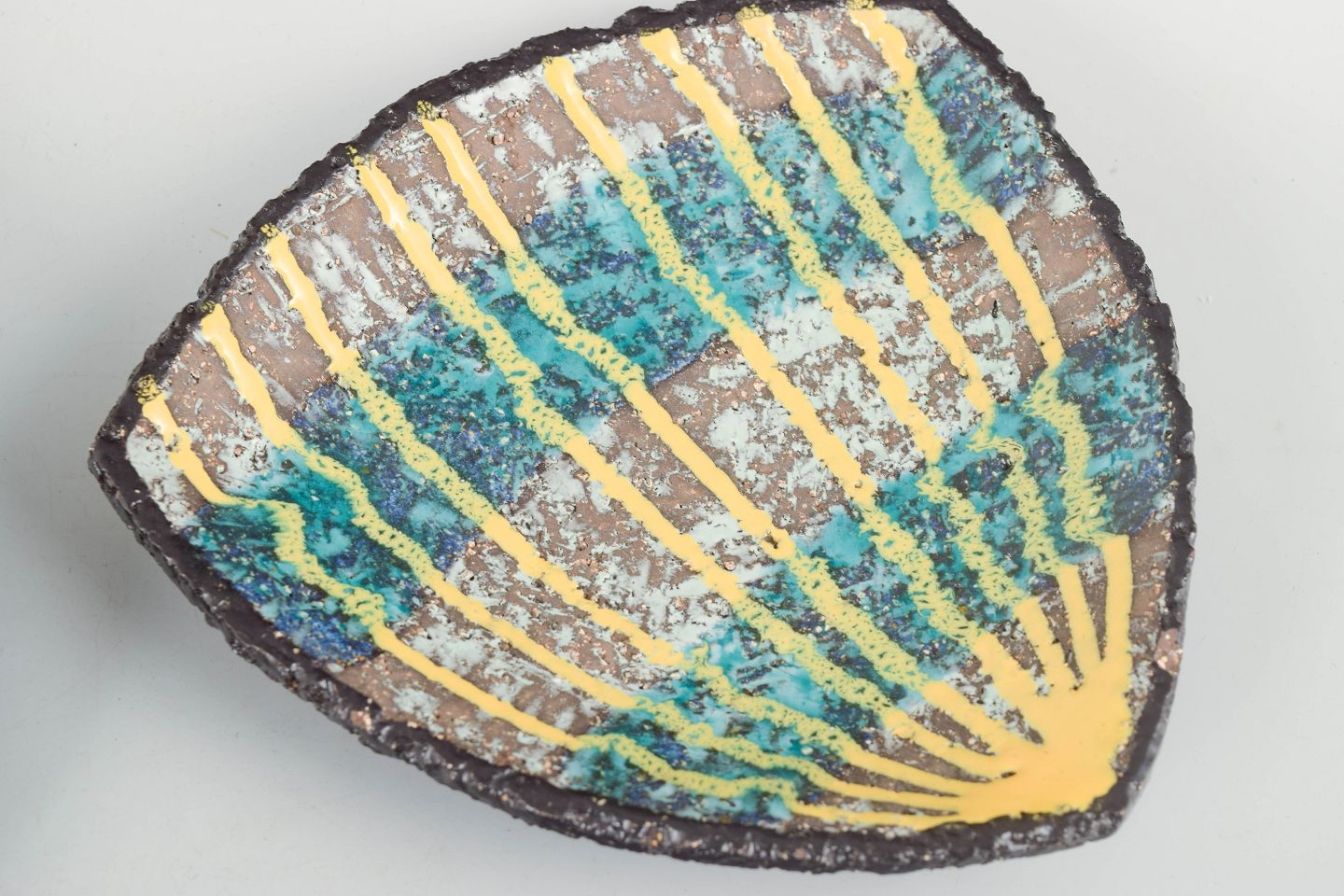 To mindre ovale keramikfade model 2548, udført i stentøj med reliefdekoration og flerfarvet glasur i blå og gule nuancer.