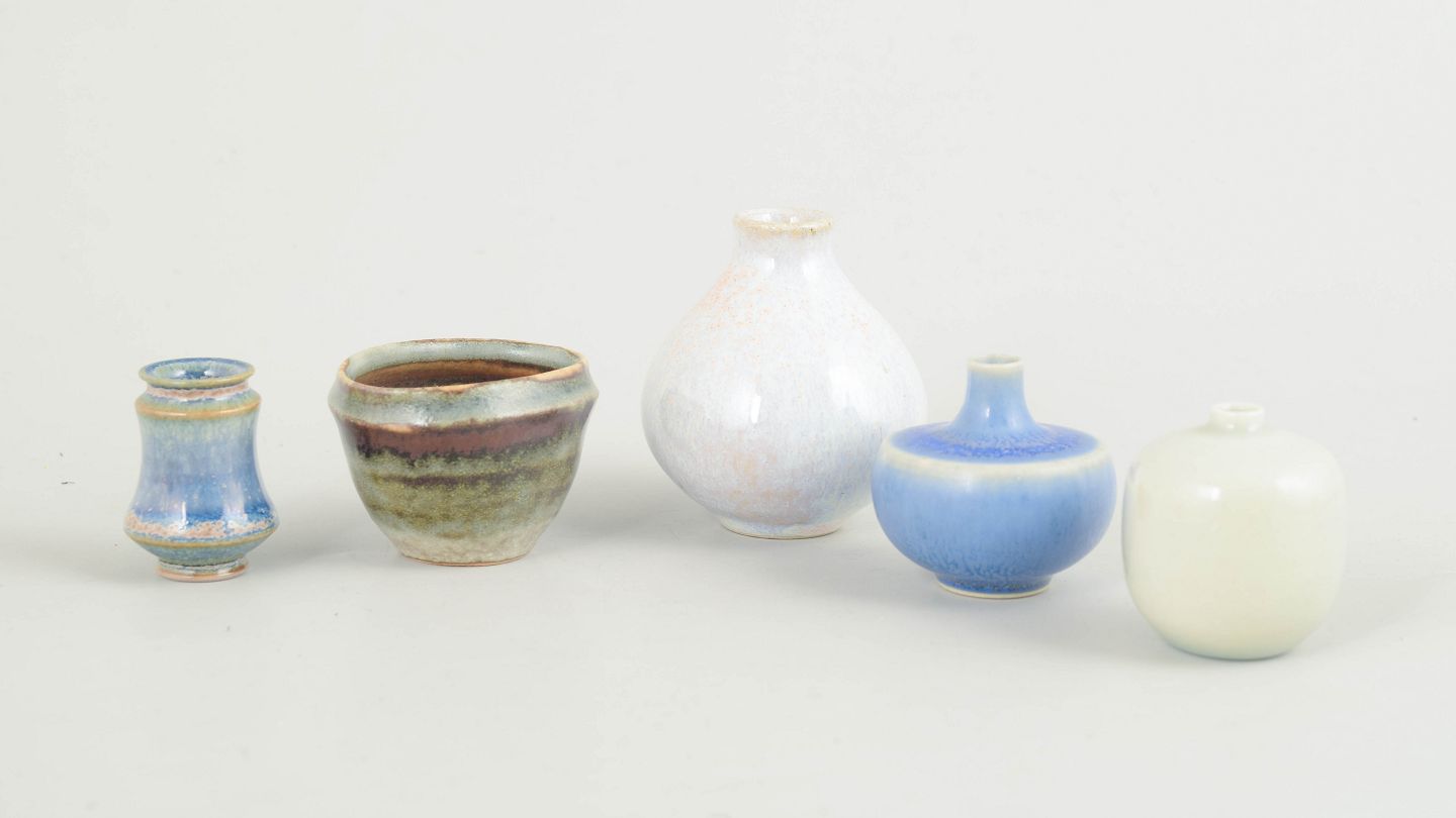 Samling af fem miniature keramikgenstande bestående af små skåle og vaser i forskellige former og glasurer. Fremstillet i keramik med flerfarvede glasurer i blå, grønne og lyse nuancer. Tre eksemplarer er fra Höganäs og andre fra forskellige producenter, herunder et umærket eksemplar.