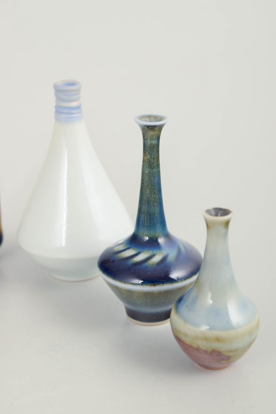 Samling af seks miniature keramikvaser i forskellige former og glasurer. Fremstillet i keramik med flerfarvede glasurer i blå, brune og lyse nuancer. Alle eksemplarer er mærket i bunden. Eksemplarer er fra Höganäs og andre fra forskellige producenter.