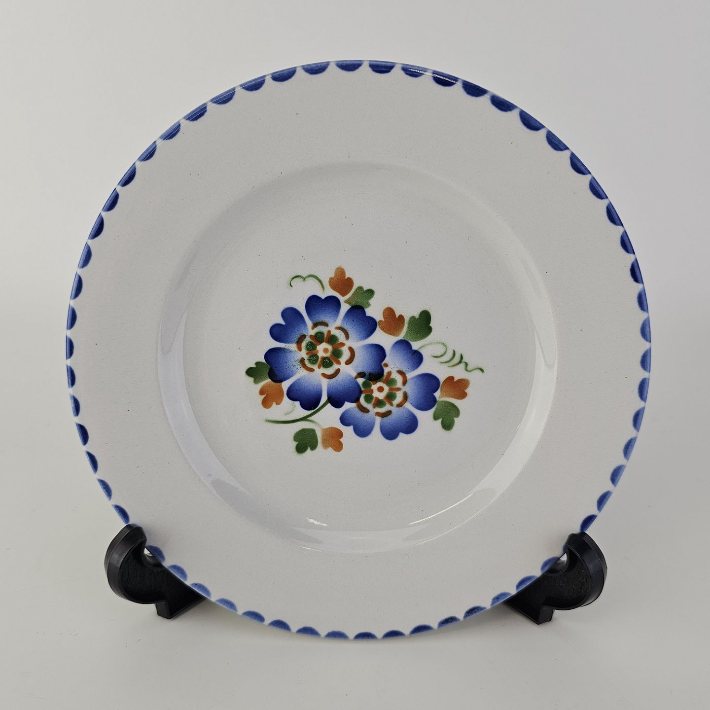 Hvidt fajancestel i stelform Sterling med motiv af blå blomster og blå prikker på kanten.